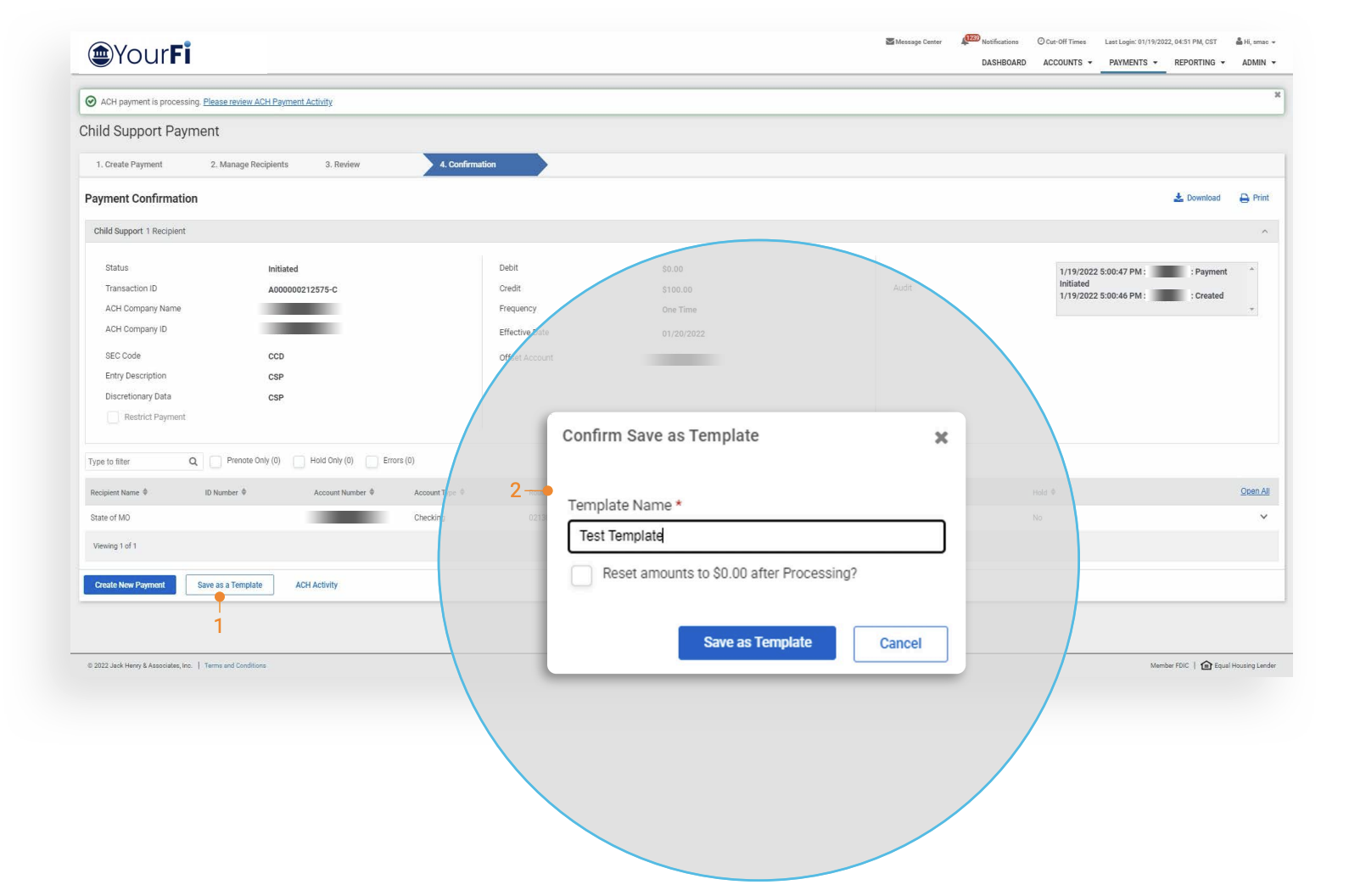 - Once the payment has been confirmed, users will have an option to create a new template for the child support payment by selecting Save as Template.