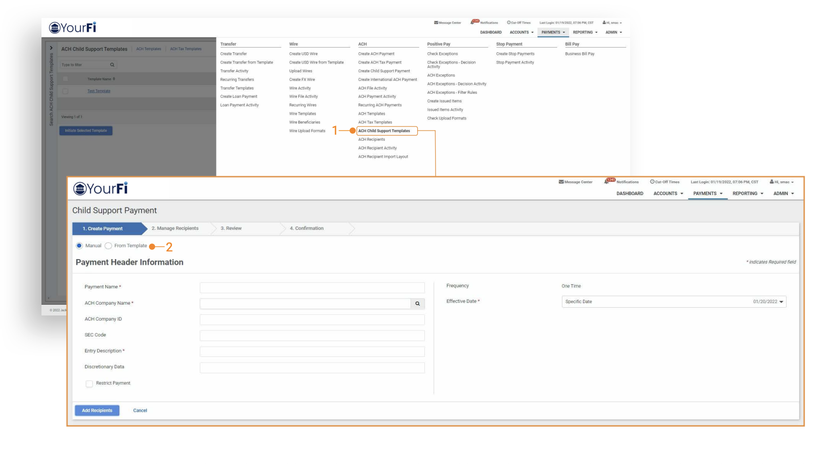 - In addition to the new menu navigation, users will have the option to select From Template during the child support payment creation workflow.