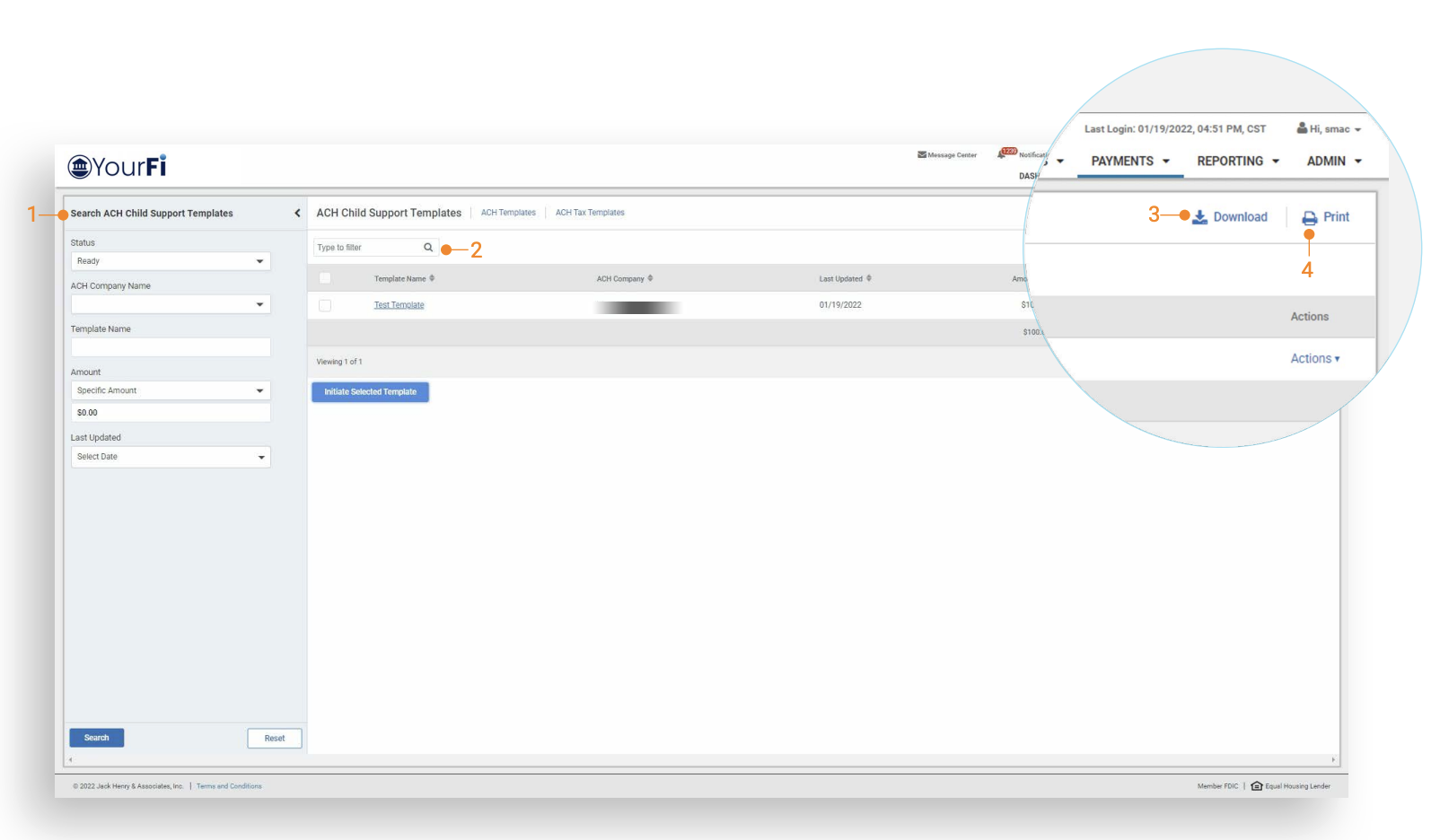 - Within the ACH Child Support Templates listing, users can filter the results, create payments from a single selected template, modify a template, print the template listing or details, or download the template listing or details.