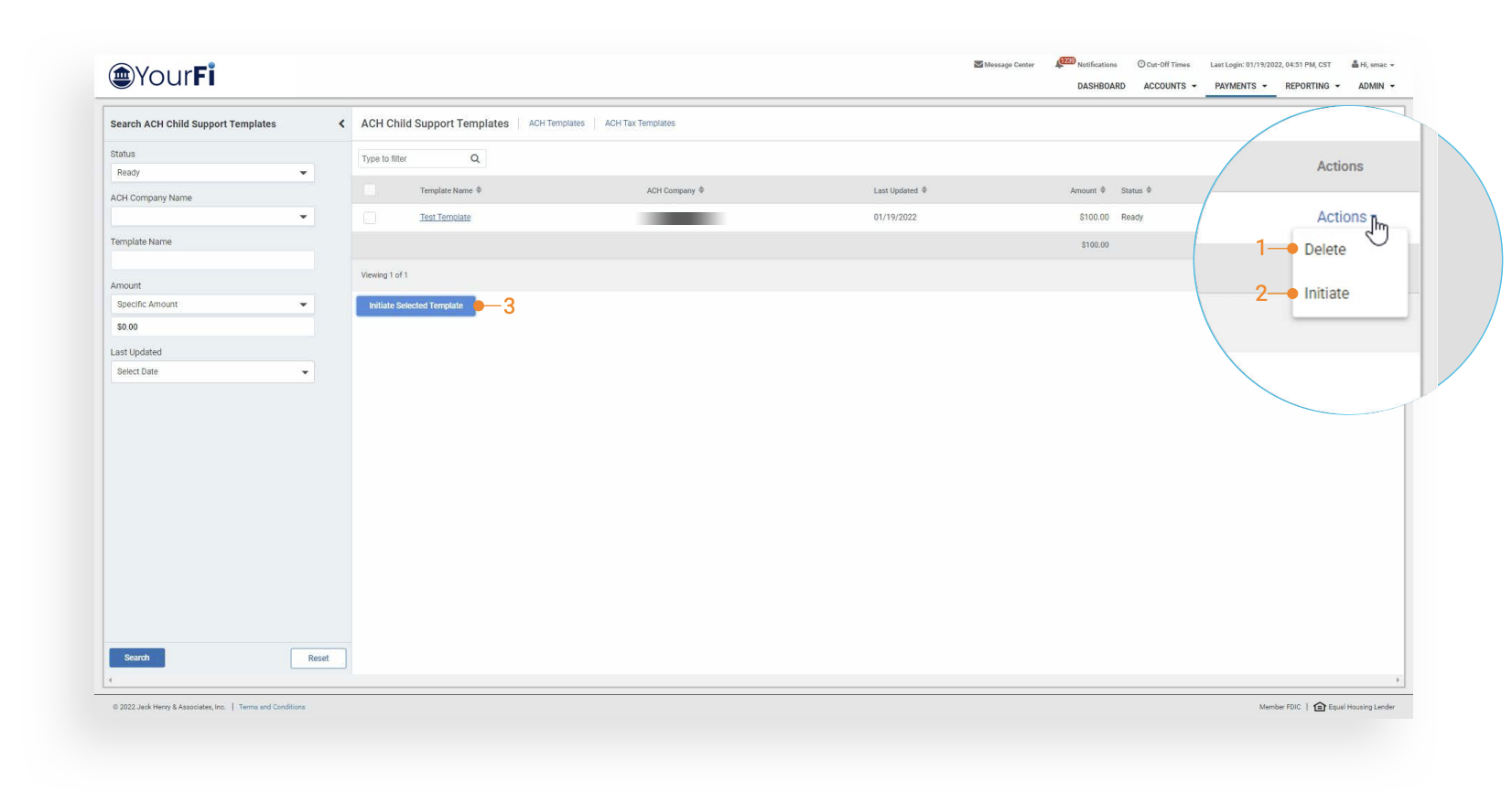 - Selection of this option will take the user to the ACH Child Support Template listing where they can select an existing template to originate a child support payment.