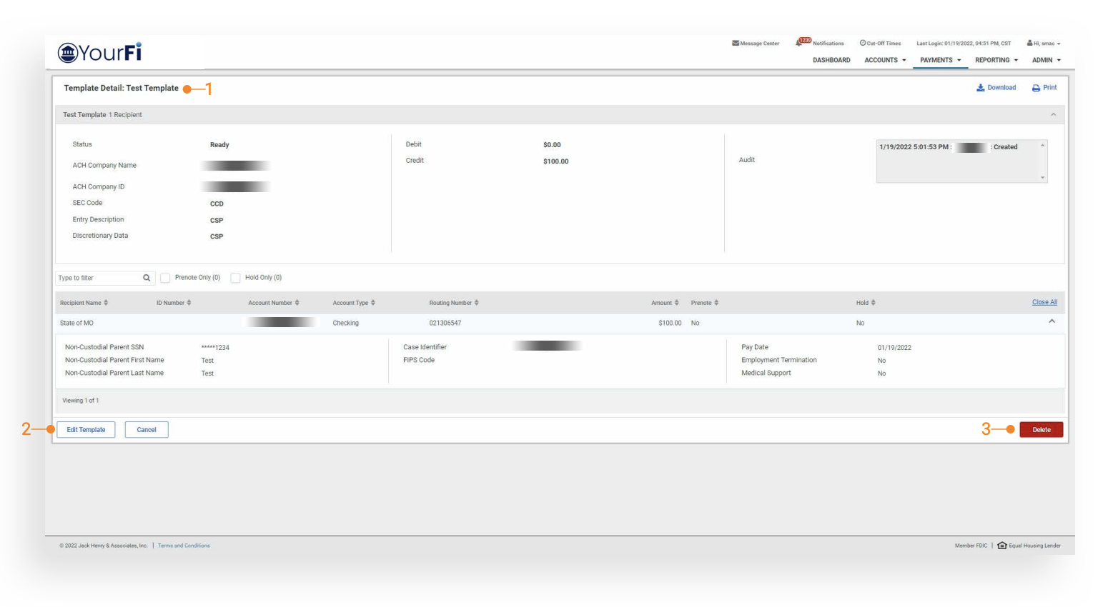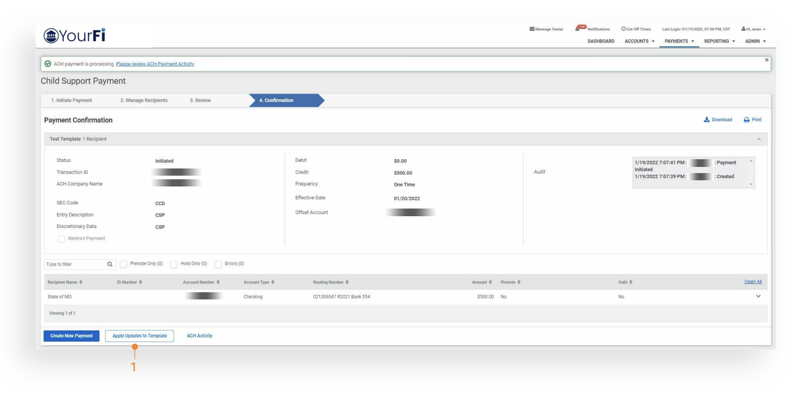 - Allows the Financial Institution’s customer to initiate Child Support Payments from a template as a Direct Payer.