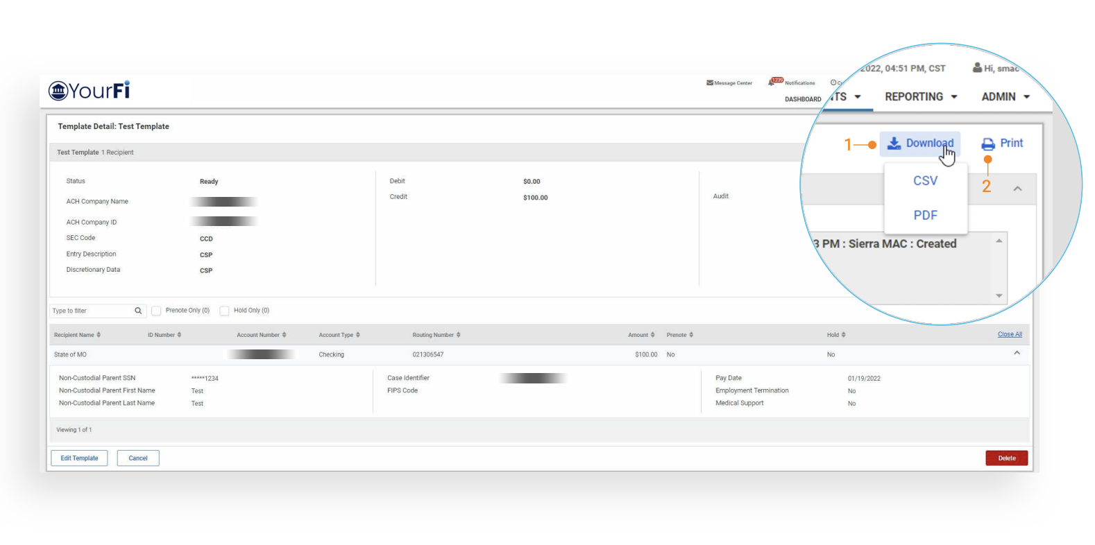 1. Download: The selected ACH Child Support Template can be downloaded in either CSV or PDF format.
