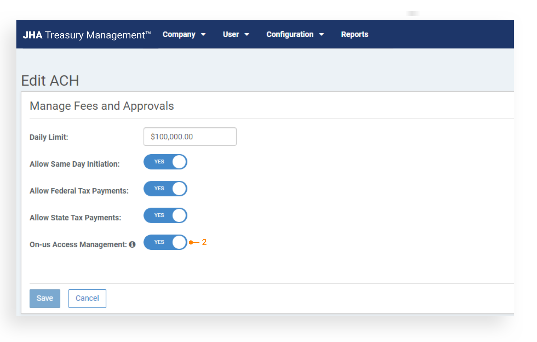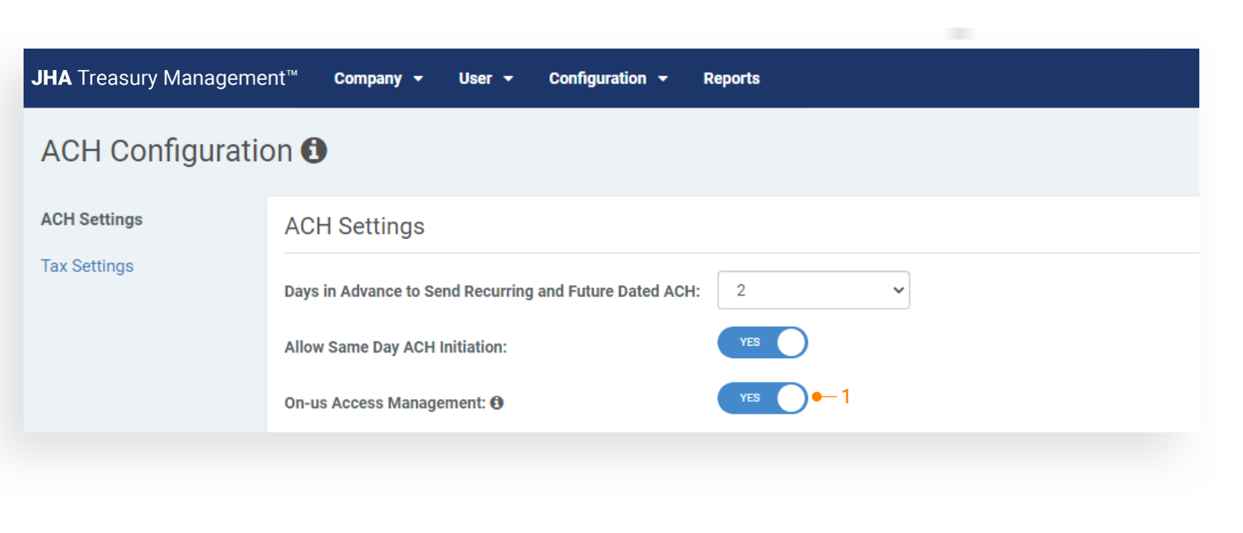 Company ACH Configuration: A new feature will display, On-us Access Management. At implementation, this feature will be inactive.