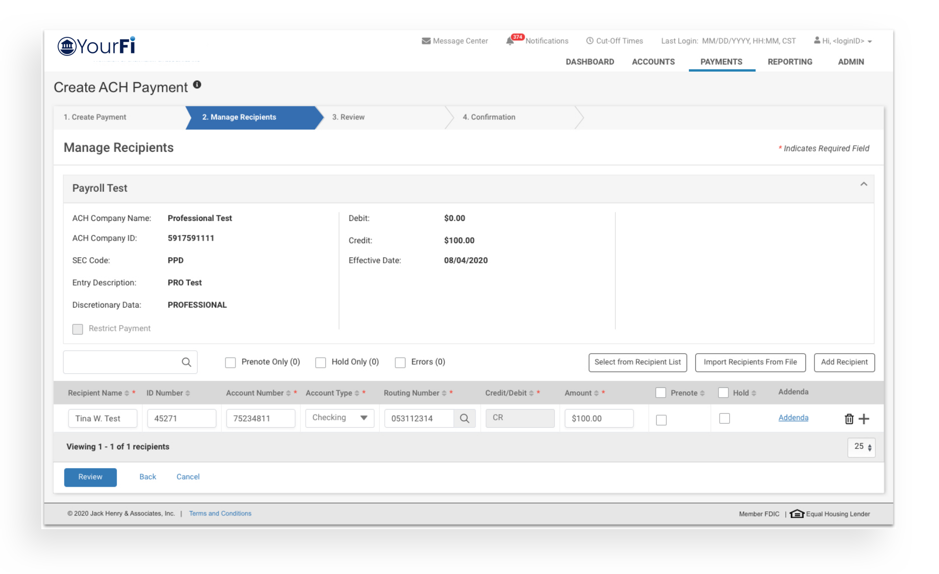 This enhancement provides an additional layer of ACH risk management for Financial Institutions. When activated, customers will only be able to enter or upload recipients with transaction types that match the allowed transaction type parameter.
