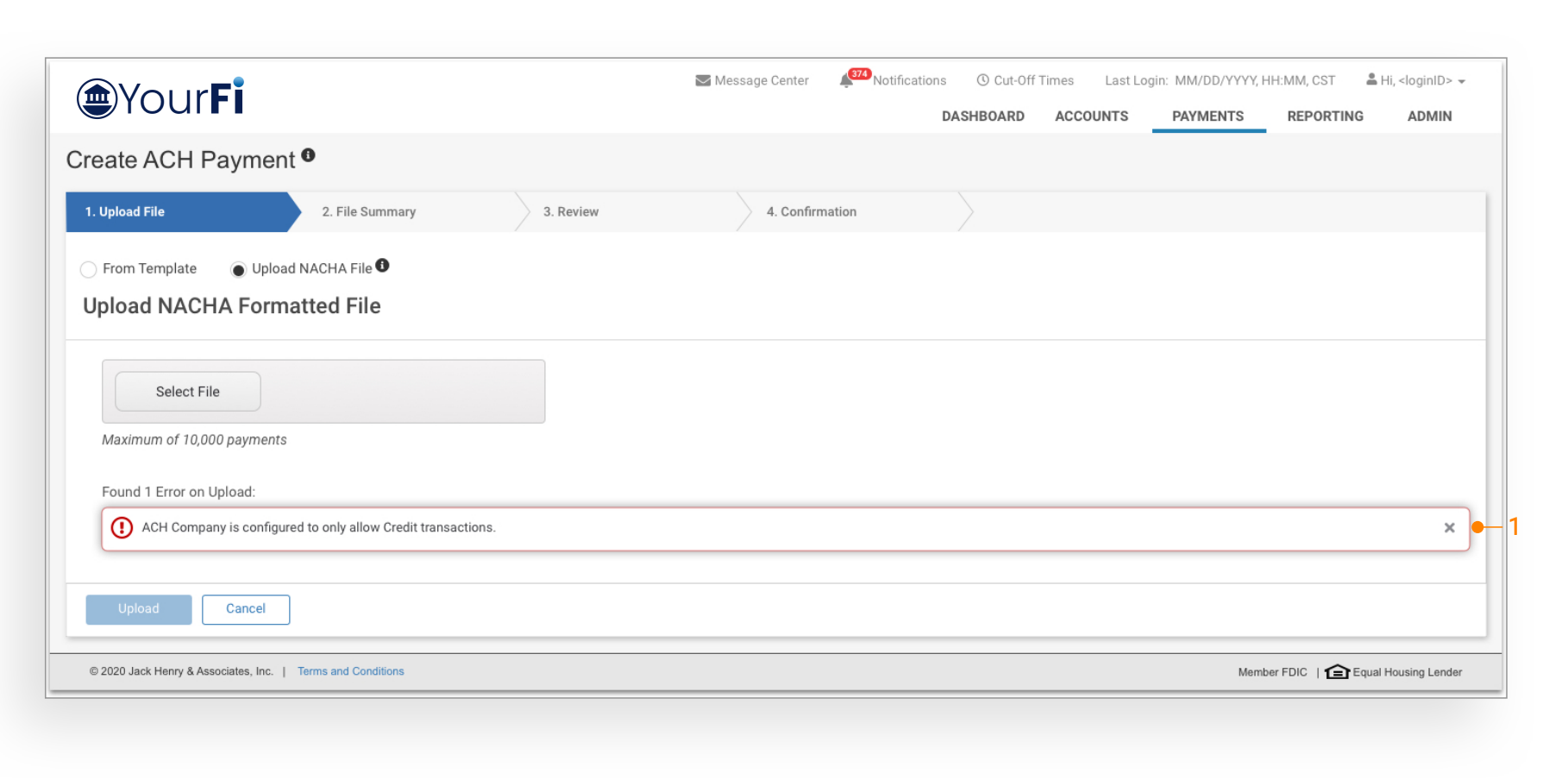 - With On-us Access Management activated, customers will no longer have the option to upload a batch with a recipient that does not match the allowed transaction type. The customer will be presented with an error message.