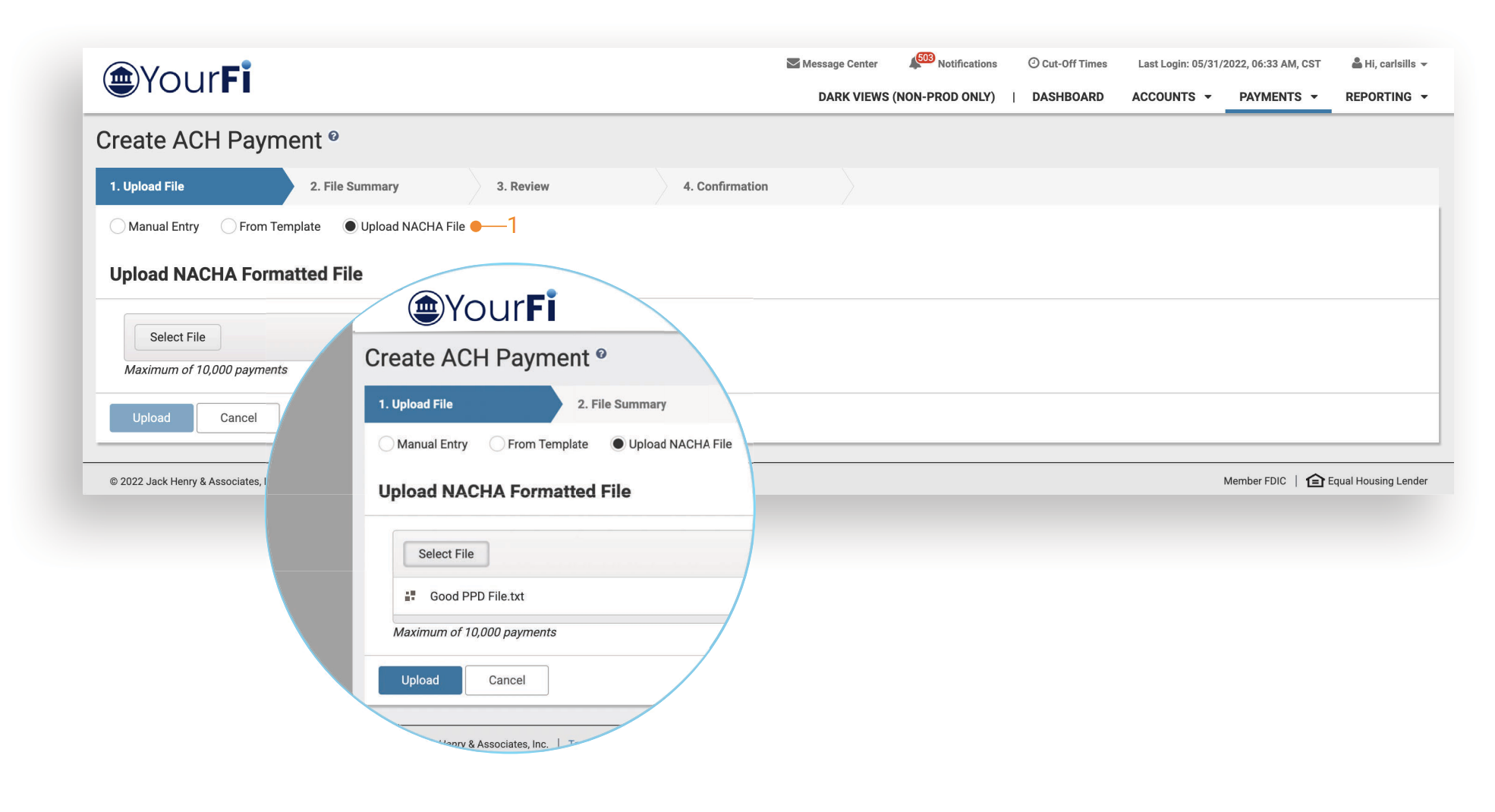 - Navigate to Main Navigation Menu > Payments > Create ACH Payment > Upload NACHA File.