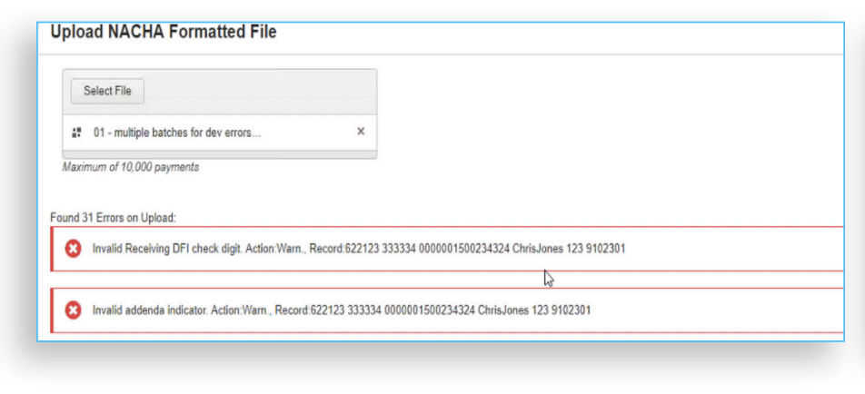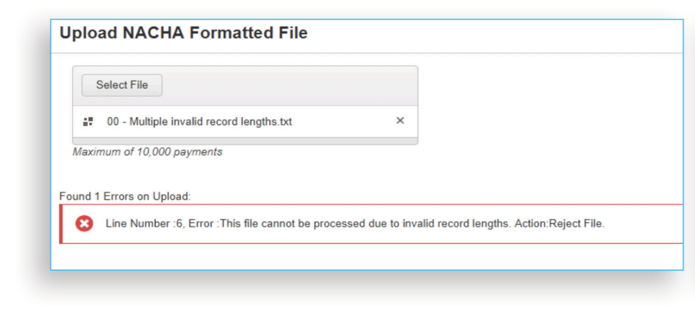ACH File Upload feature of the TM platform is an important capability within the business payment process. Files that meet the following criteria can be uploaded for processing using the Create ACH Payment feature within JHA Treasury Management: NACHAformatted file, No more than 10,000 payments and Less than 10 MB in size.