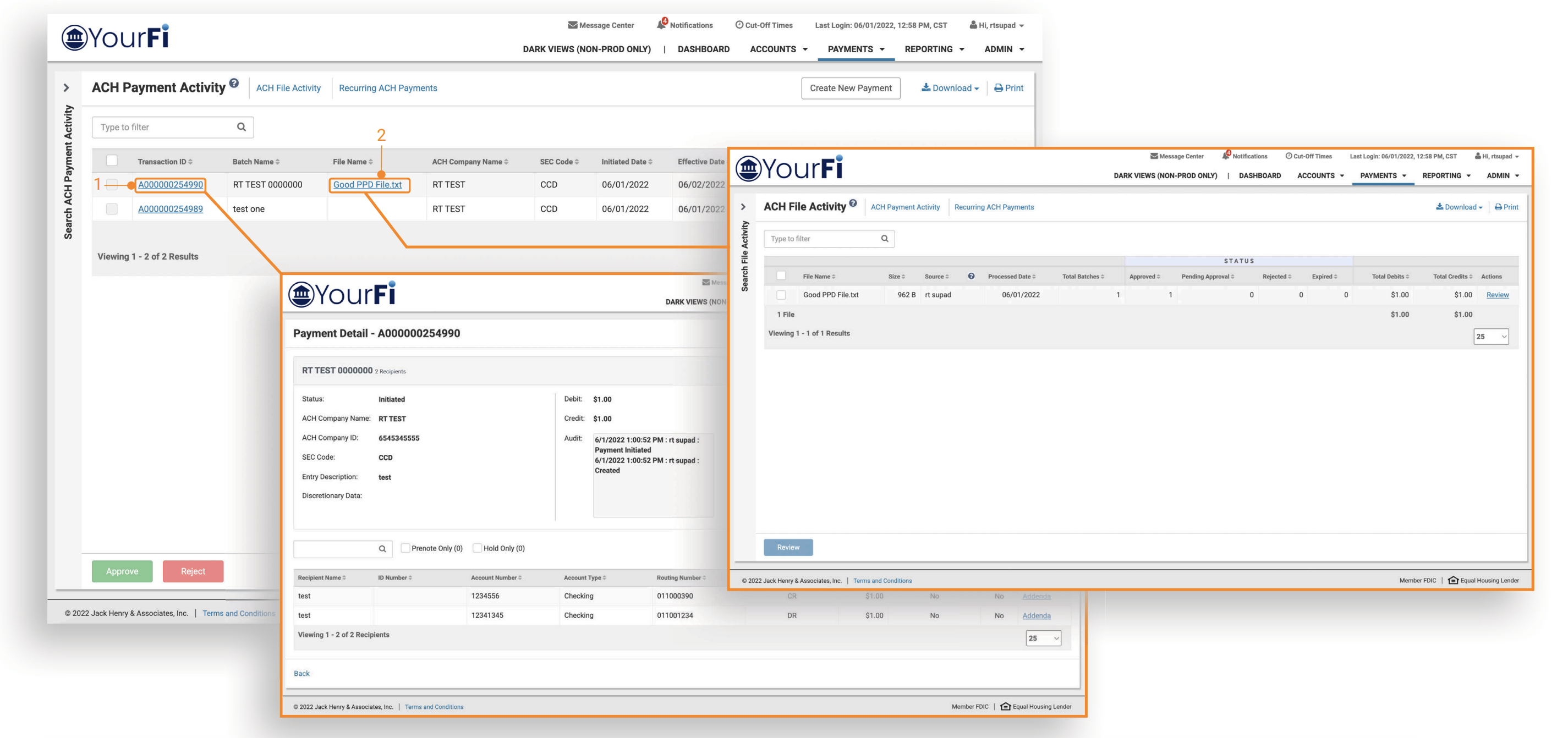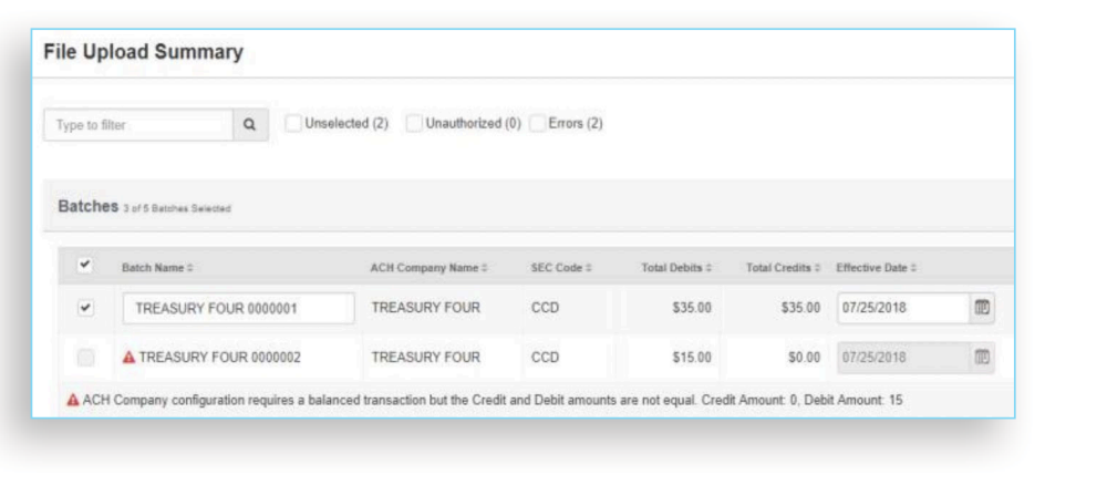 - File Name opens the ACH file’s activity, where status information can be viewed.