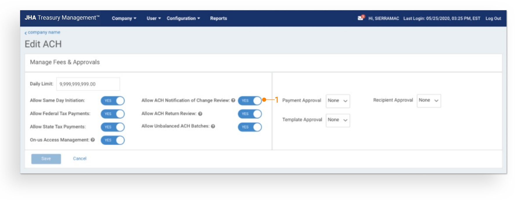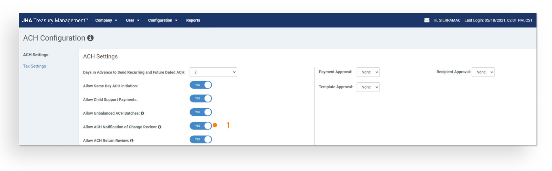 Allow ACH Notification of Change Review: This configuration will default to inactive at implementation. Until this configuration is activated, customers will not be able to review notification of change activity within the platform.