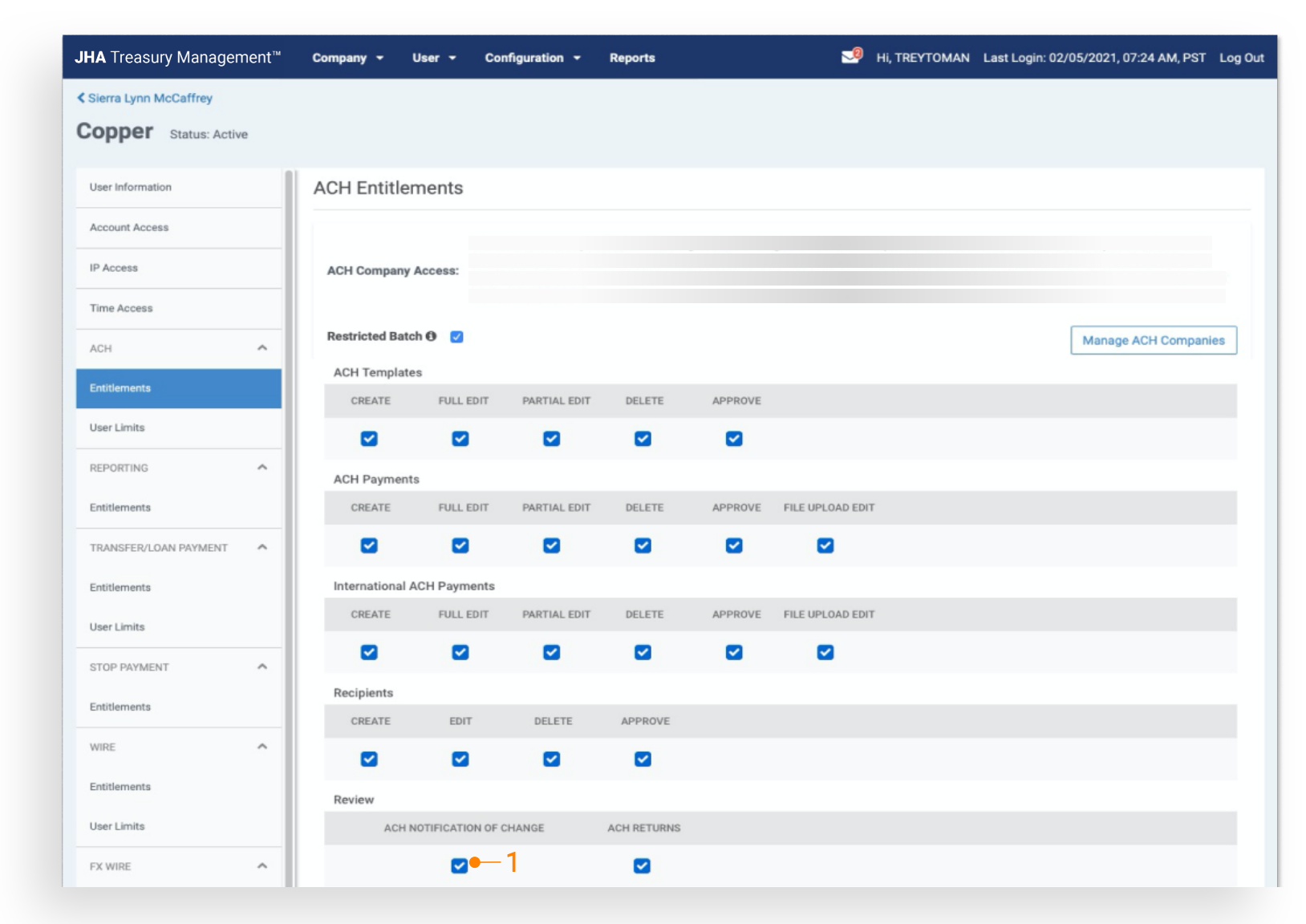 Allow ACH Notification of Change Review: Once this configuration is activated, users can be entitled to the correlating user entitlement.