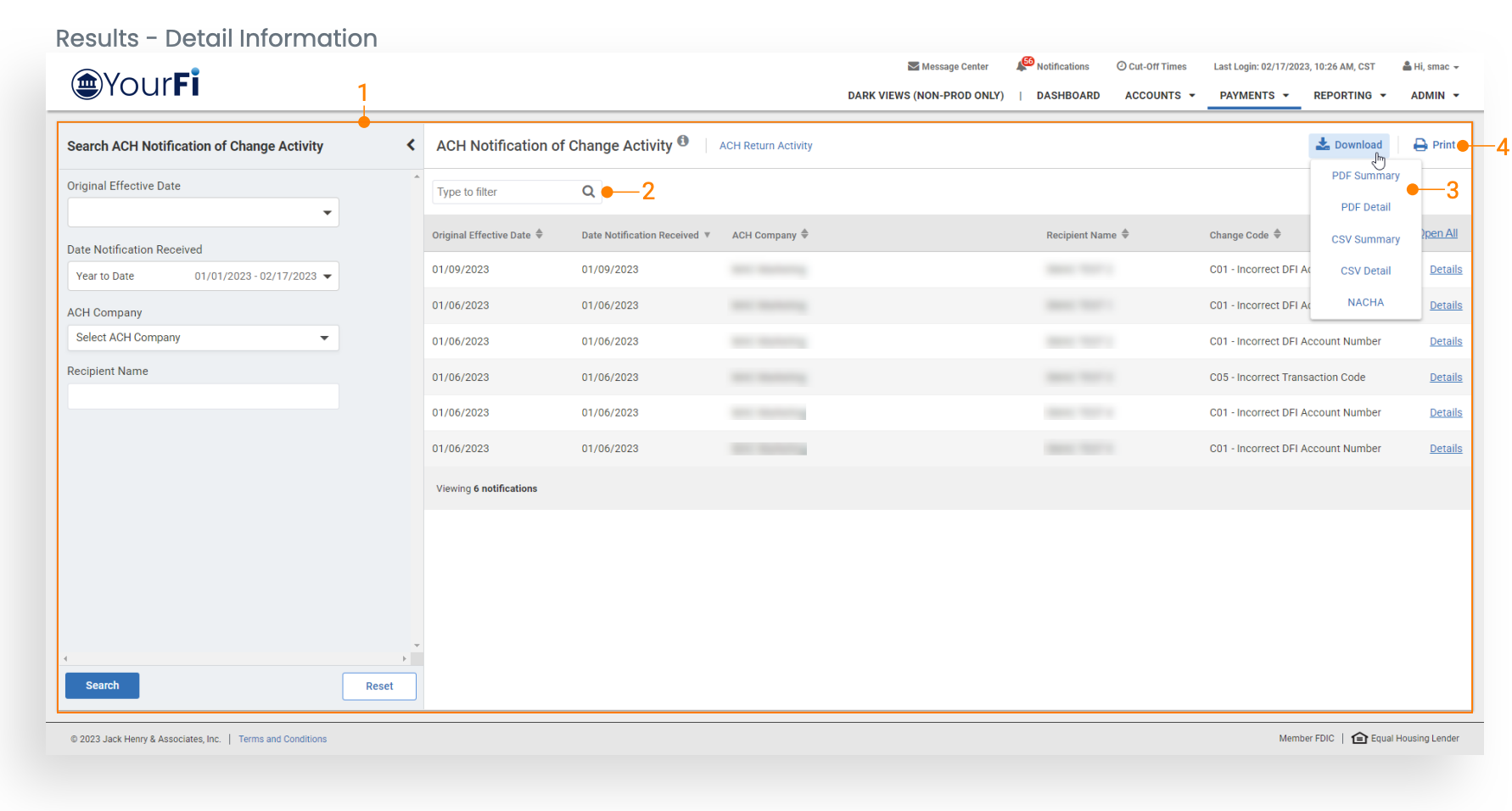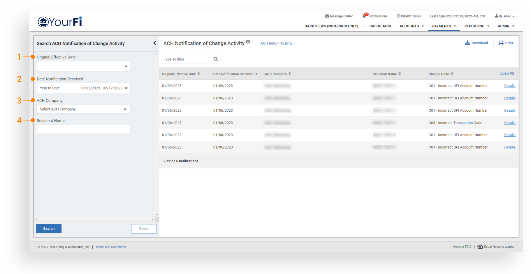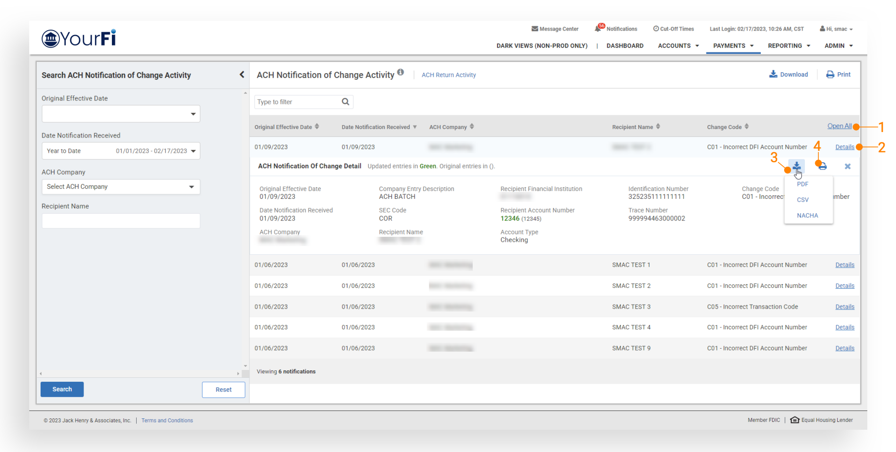 ACH Notification of Change: Once this user entitlement is activated, customers will be able to review notification of change activity.