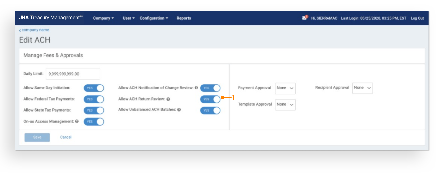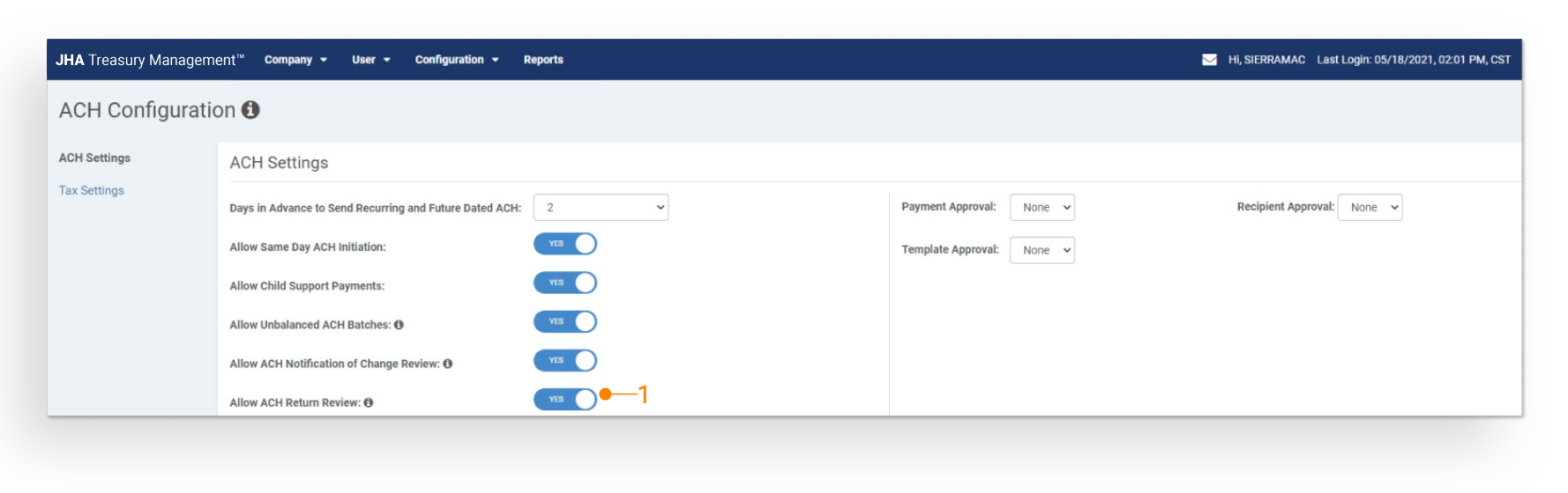 Allow ACH Return Review: This configuration will default to inactive at implementation. Until this configuration is activated, customers will not be able to review return activity within the platform.