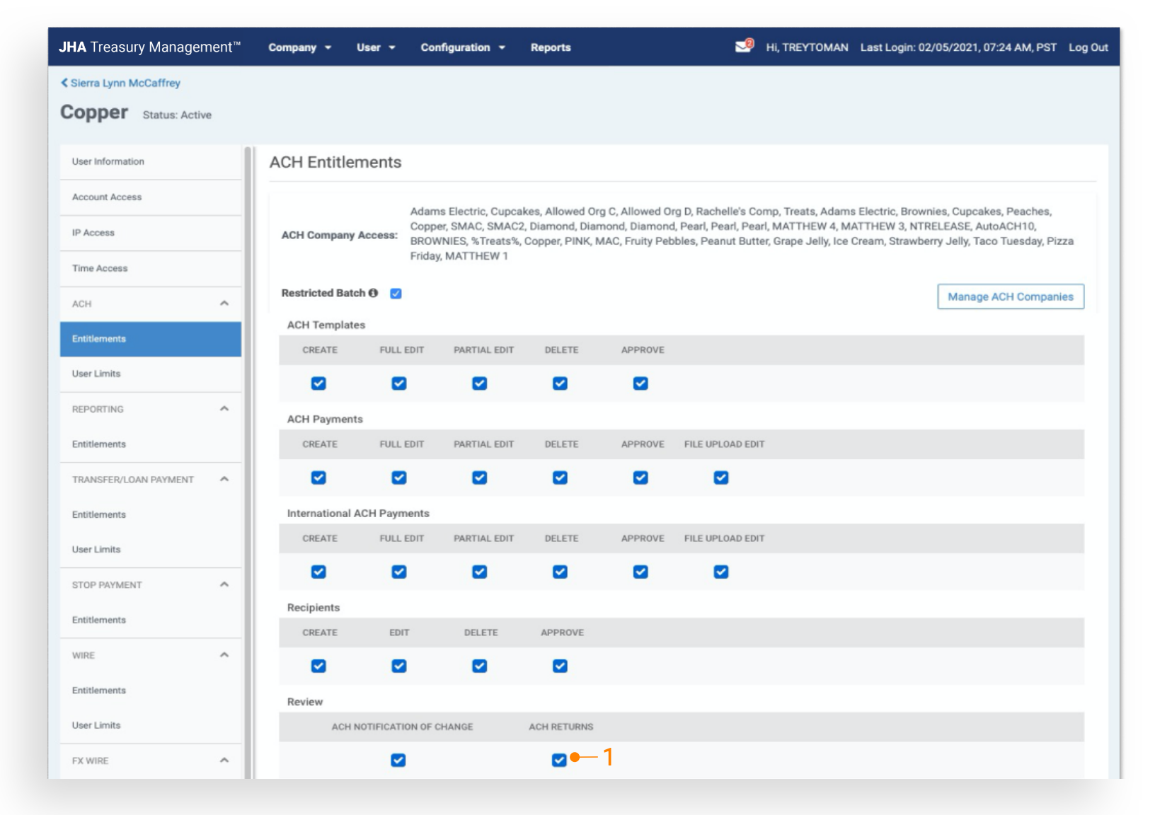 ACH Returns: Once this user entitlement is activated, customers will be able to review return activity.