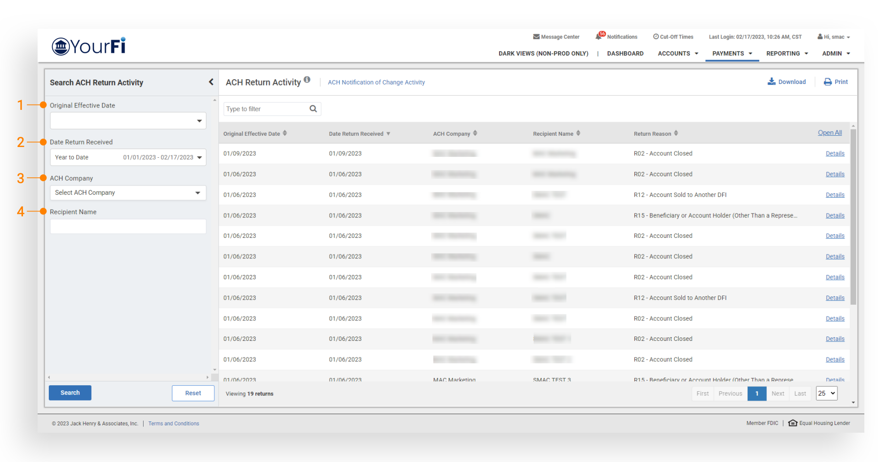 An ACH Return may be created by the receiving bank to inform the originator that the transaction has not been posted and was returned for the reason indicated, such as the account has been closed. This enhancement will provide customers with the ability to review returns, allowing the customer to identify the transaction and update any existing transactions or templates that need to be modified, as well as working with the recipient to correct information pertaining to future transactions.