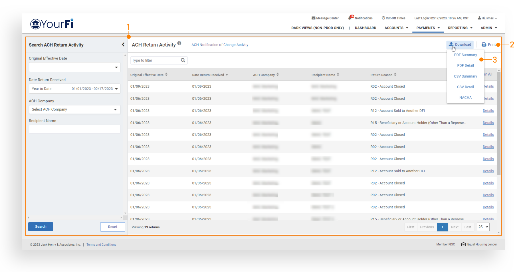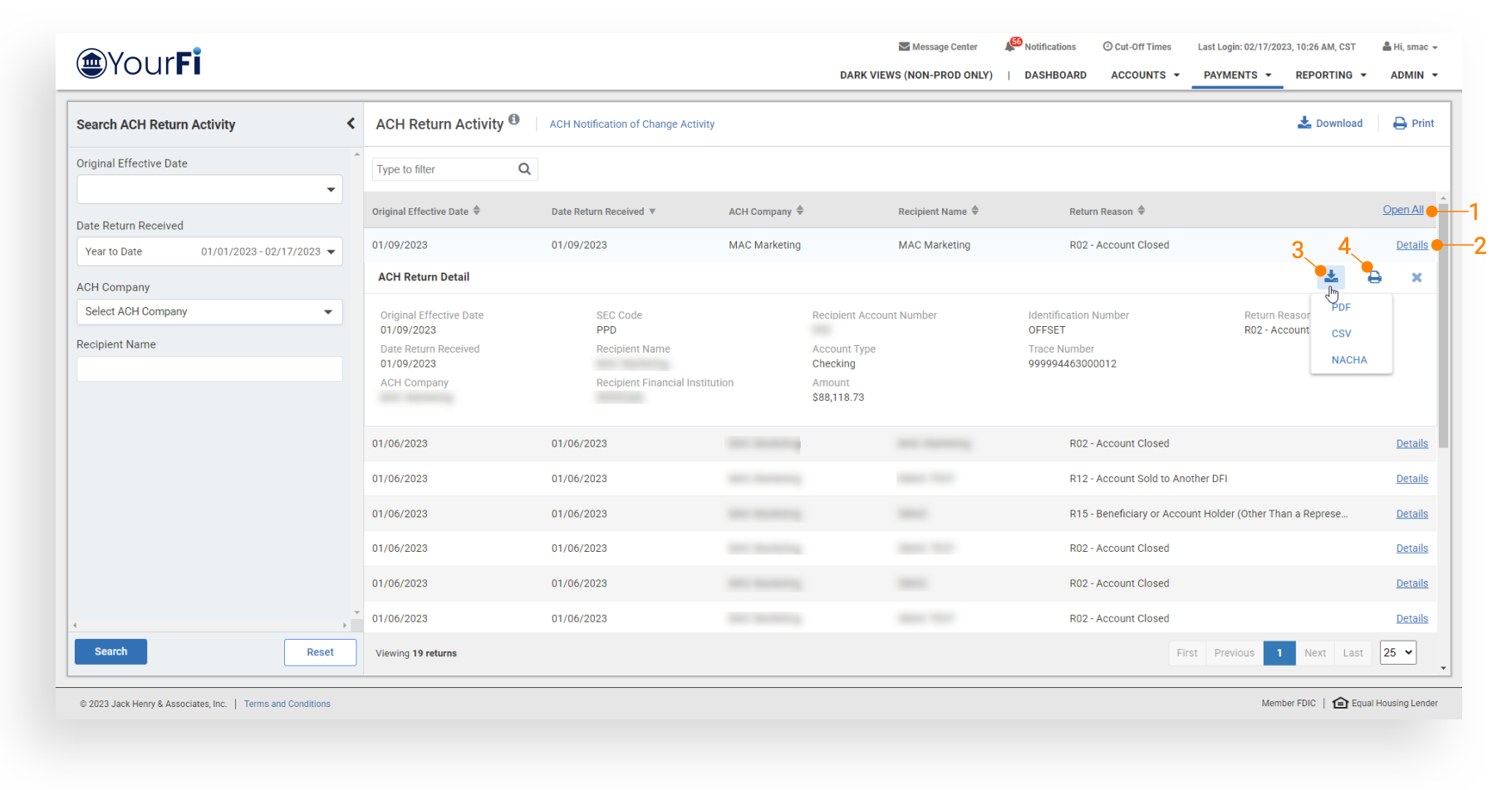 3. Download: Within each individual return, users may select the download icon to download the details in PDF, CSV, or NACHA format.