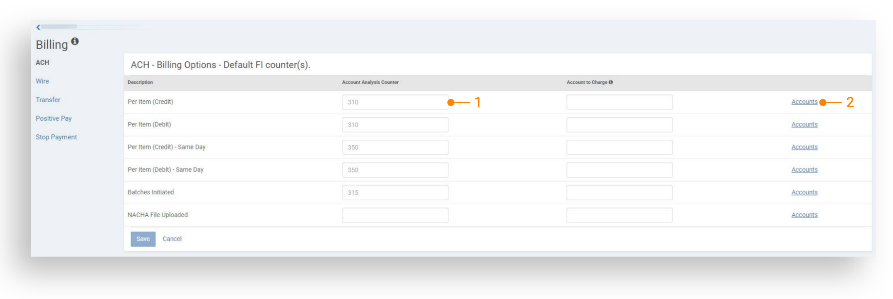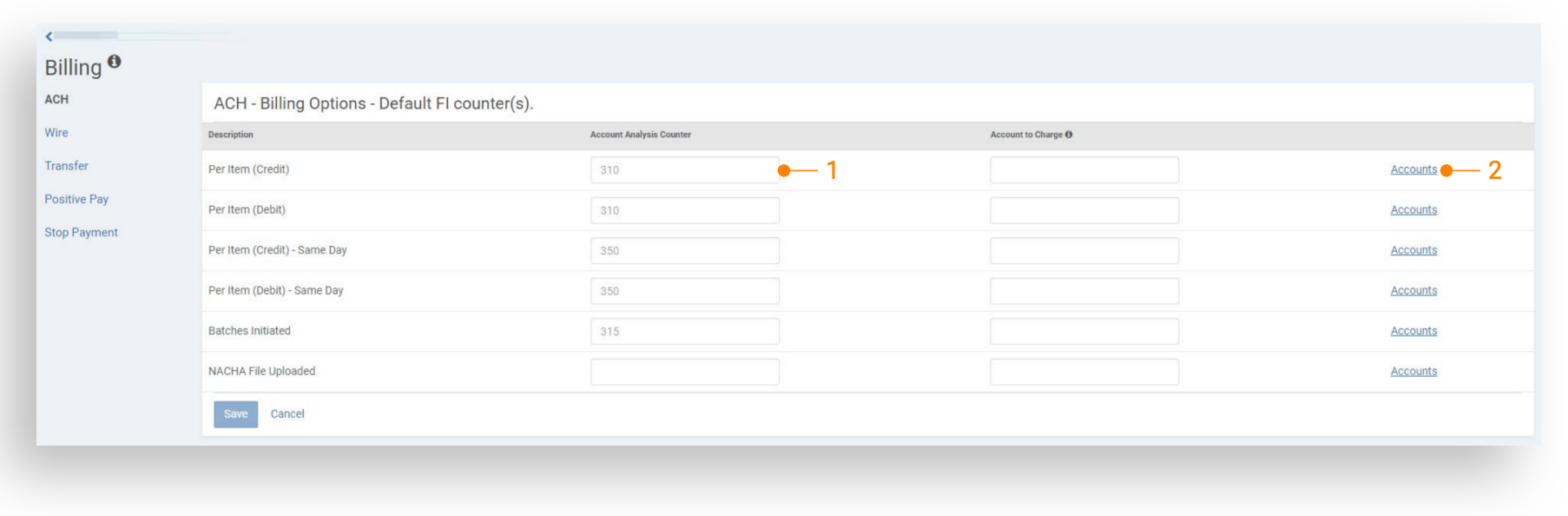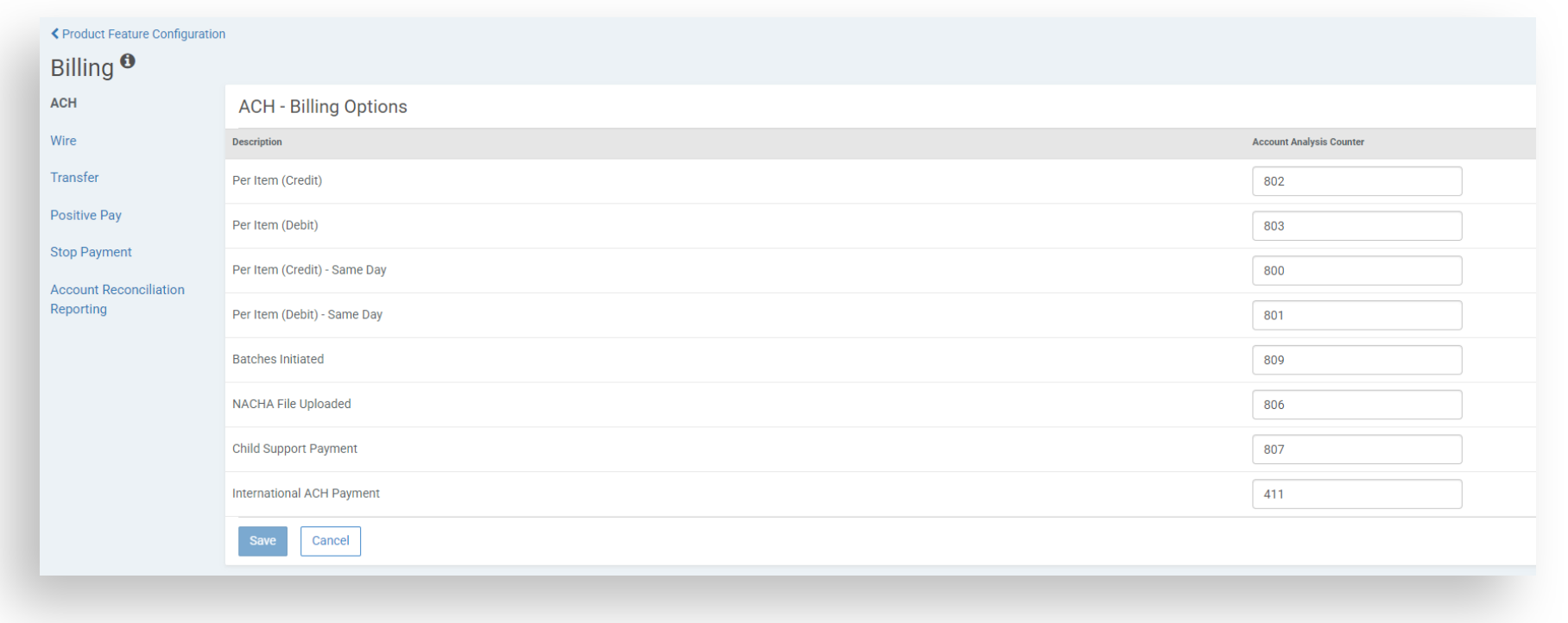 Important: The Billing Configuration within Treasury Management relies on counters set up with Enhanced Account Analysis to pass volume information. Treasury Management does not integrate with Standard Account Analysis.