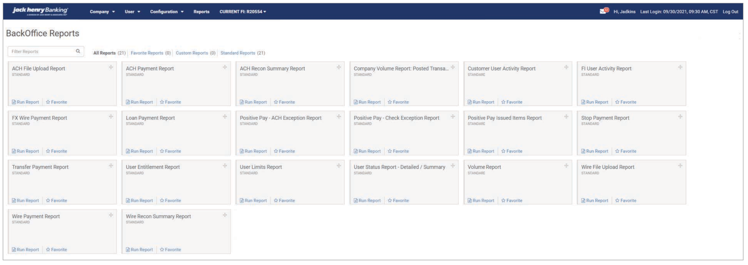 All Reports will display all reports on the dashboard, which includes all standard reports and custom reports. Users can toggle to Favorite Reports, Custom Reports or Standard Reports. Reports will display in alphabetical order; however, users can arrange the tiles in their preferred order using the drag and drop feature.