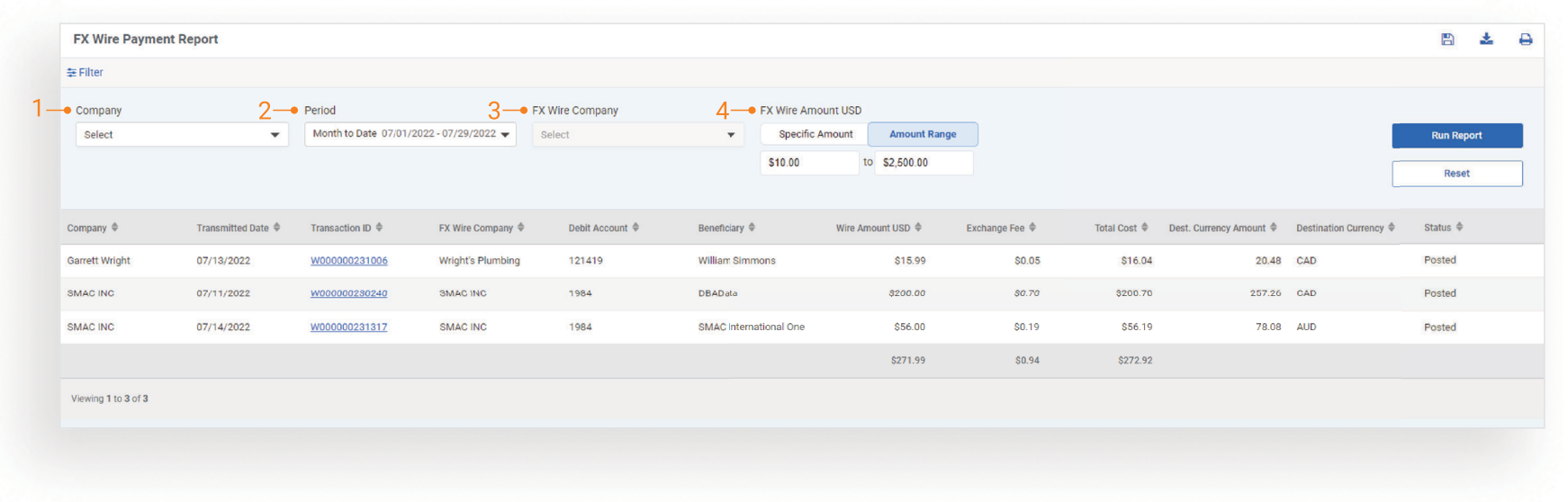 | FX Wire Payment Report | Lists the following payment information: Company Name, Transmitted Date, Transaction ID, FX Wire Company, Debit Account, Beneficiary, Wire Amount {USD), Exchange Fee, Total Cost, Destination Currency and Destination Currency Amount. Complete payment details, including audit information can be viewed by clicking the Transaction ID hyperlink. |