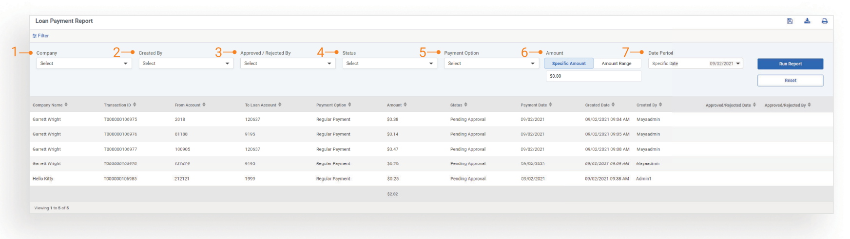 | Loan Payment Report | Lists the Company Name, Transaction ID, From Account, To Loan Account, Payment Option, Amount, Status, Payment Date, Created Date, Created By and approval information based on the selected search criteria. If no filter criteria is selected the results show all loan payments for all companies for the current date. |