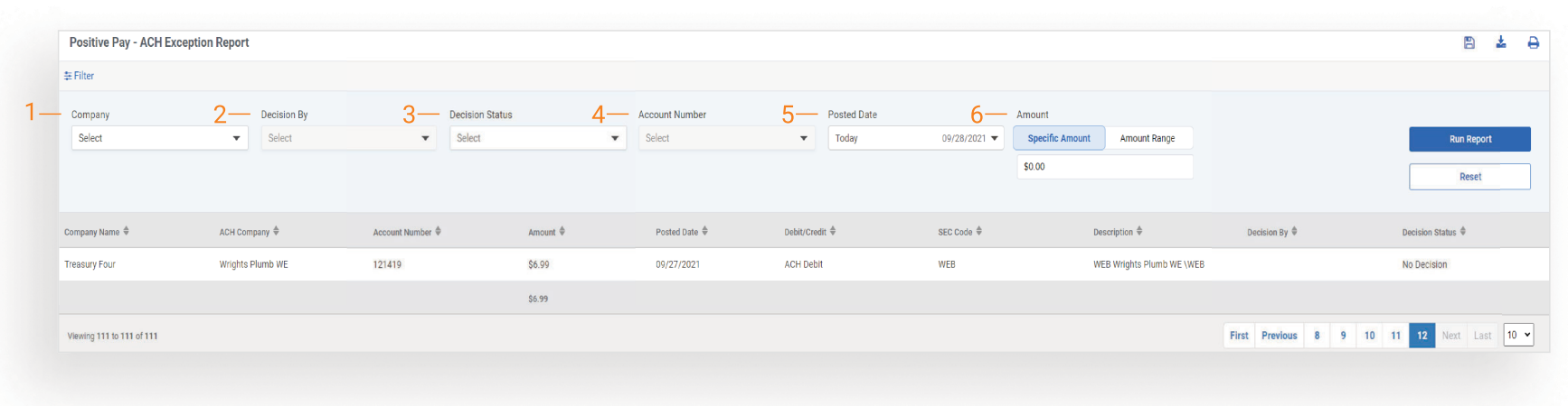 | Positive Pay - ACH Exception Report | Lists the Company Name, ACH Company, Account Number, Amount, Posted Date, ACH Type {Debit/Credit), SEC Code, Description, Decision By and Decision Status all ACH exceptions based on the selected criteria. If no filter criteria is selected the results show all ACH exceptions for all companies for the current date. |