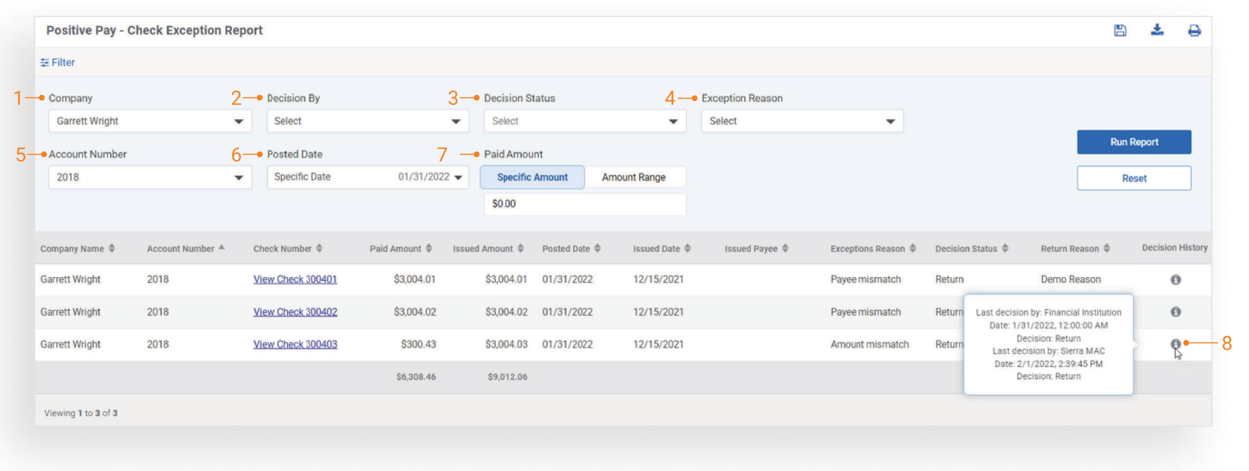 | Positive Pay - Check Exception Report | Lists Check Number, Paid Amount, Issued Amount, Posted Date, Issued Date, Issued Payee, Exception Reason, Return Reason and Decision status for the selected company and accounts. |