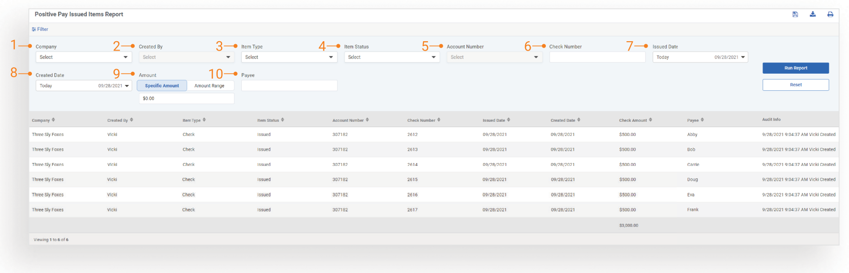 | Positive Pay Issued Items Report | Lists Company, Name, Created By, Item Type, Item Status, Account Number, Check Number, Issued Date, Created Date, Check Amount, Payee and Audit Info based on the selected criteria. If no filter criteria is selected the results show all issued items for all companies for the current date. |