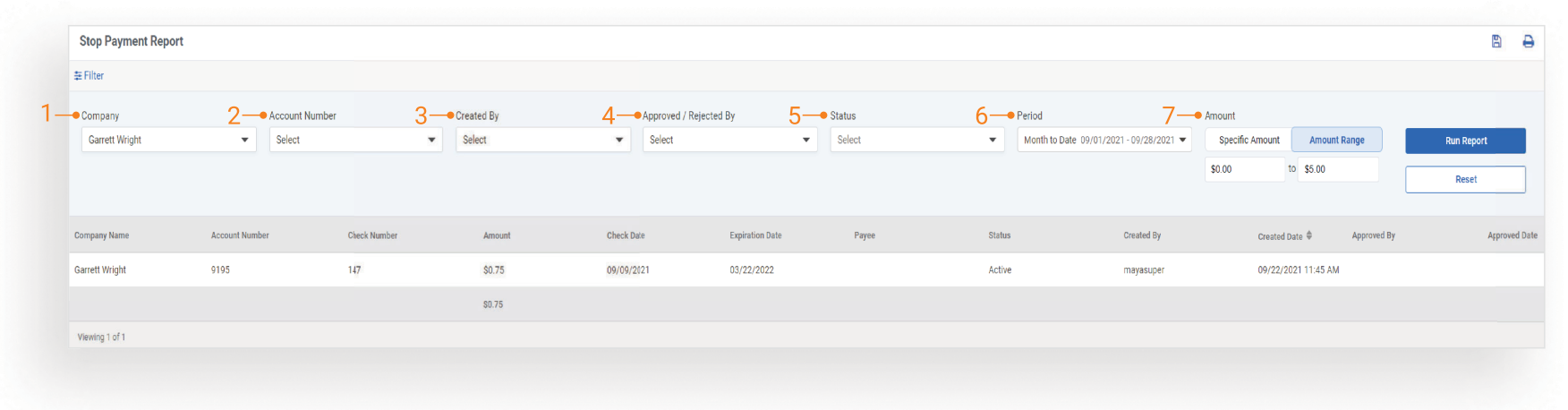 | Stop Payment Report | Lists Company Name, Account Number, Check Number, Amount, Check Date, Expiration Date, Payee, Status, Created By, Created Date and approval information based on the selected criteria. If no filter criteria is selected the results show all stop payments for all companies created for the current date. |