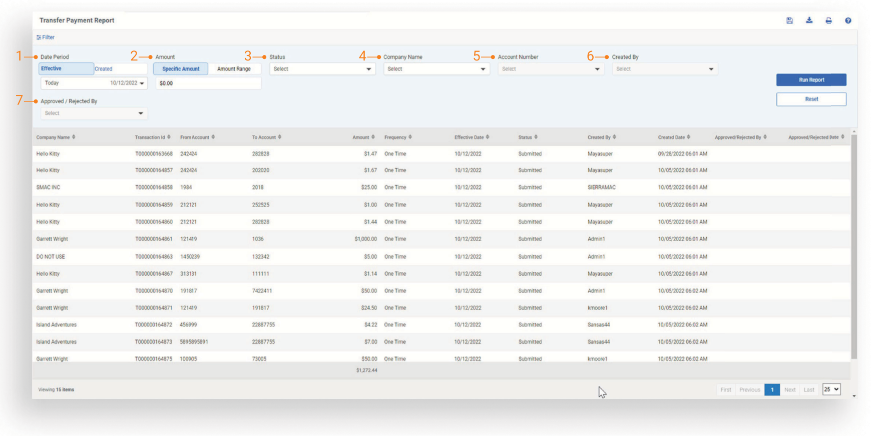 | Transfer Payment Report | Lists the Company Name, Transaction ID, From Account, To Account, Amount, Frequency, Transfer Date, Status, Created By, Created Date and approval information based on the selected criteria. If no filter criteria is selected the results will show transfer payments for all companies for the current date. |