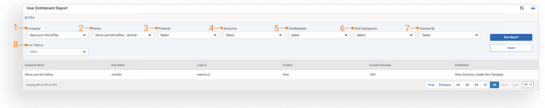 | User Entitlement Report | Lists the Company Name, User Name, Login ID, Product. Account/Company and Entitlements based on the selected criteria. If no filter criteria is selected the results will show all product entitlements for all users by company. |