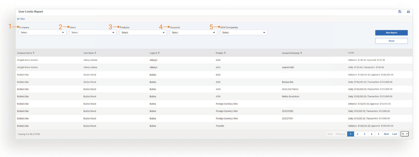 | User Limits Report | Lists the Company Name, User Name, Login ID, Product, Accounts/ ACH or Wire Company and Limits {daily, initiation, transaction and approval) based on the selected criteria. If no filter criteria is selected the results will show all user limits by company. |
