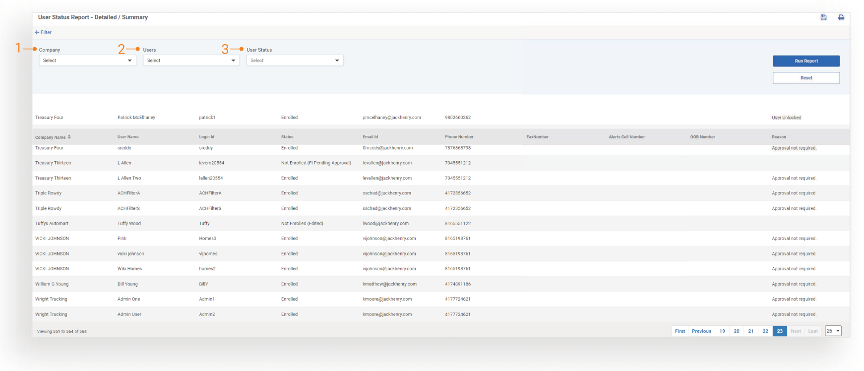 | User Status Report Detailed/Summary | Lists the Company Name, User Name , Login ID, Status, Email ID, Phone Number, Fax Number, Alerts Cell Number, 008 Number and Status based on the selected criteria. If no filter criteria is selected the results will show all companies by user. |