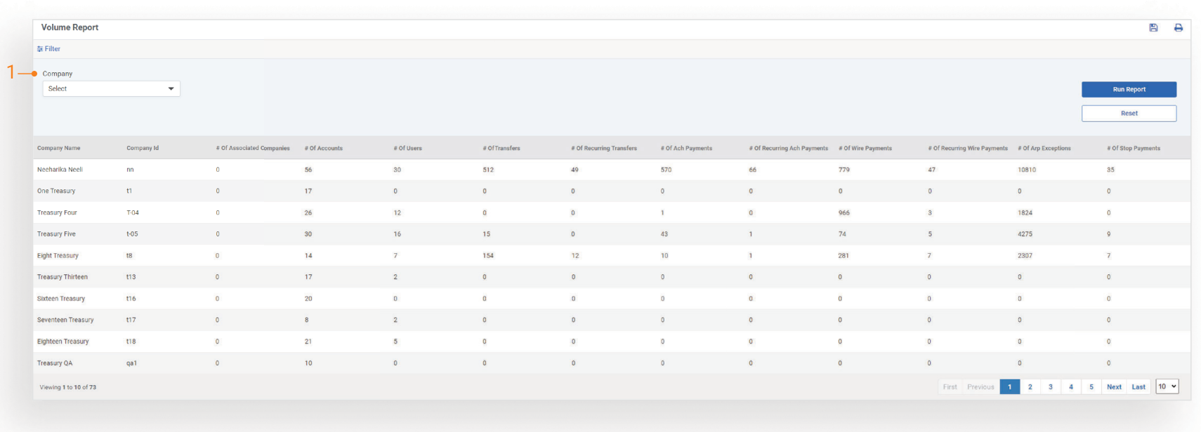 | Volume Report | Lists the Company Name, Company ID, along with the total number of Associated Companies, Accounts, Users, Transfers, ACH Payments, Wire Payments, Positive Pay Exceptions and Stop Payments for the selected company. |