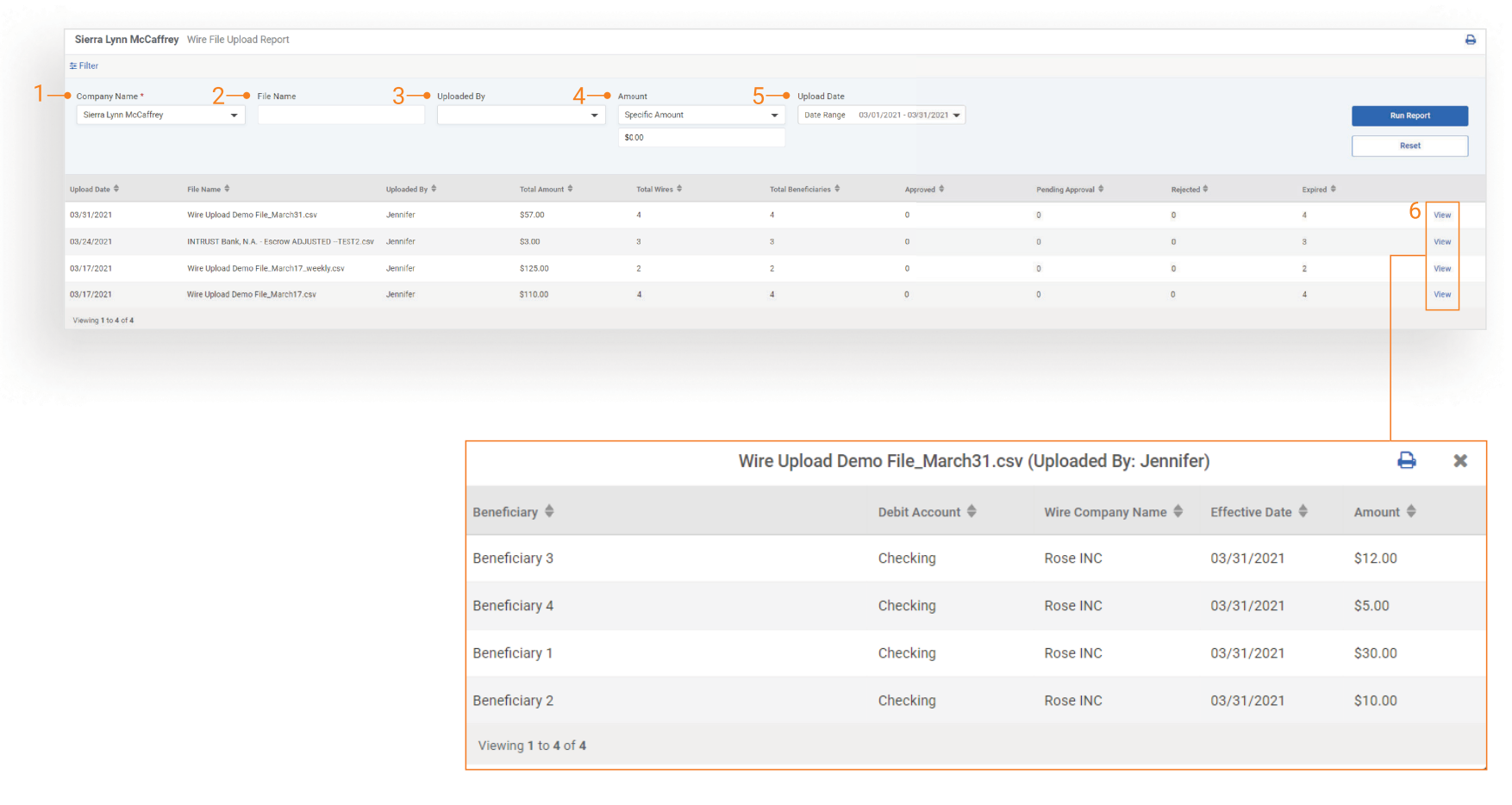 | Wire File Upload Report | Lists the File Name, Upload By, Total Amount along with the total number of wire payments in each status for the selected company. |