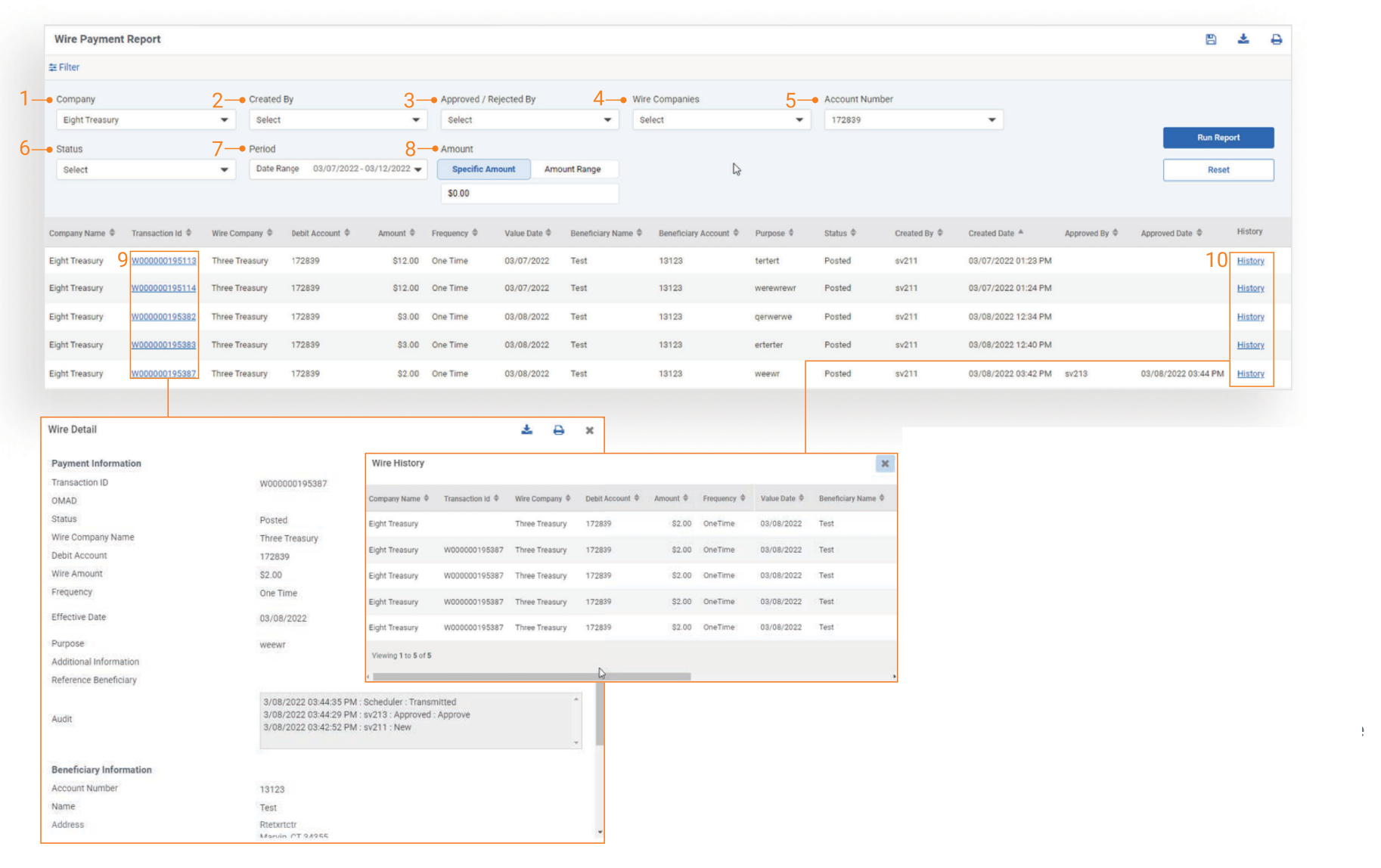 | Wire Payment Report | Lists all Wire Payments and associated summary information within the date period for the selected companies. Additional details, including audit information can be viewed by selecting the Transaction ID hyperlink. |