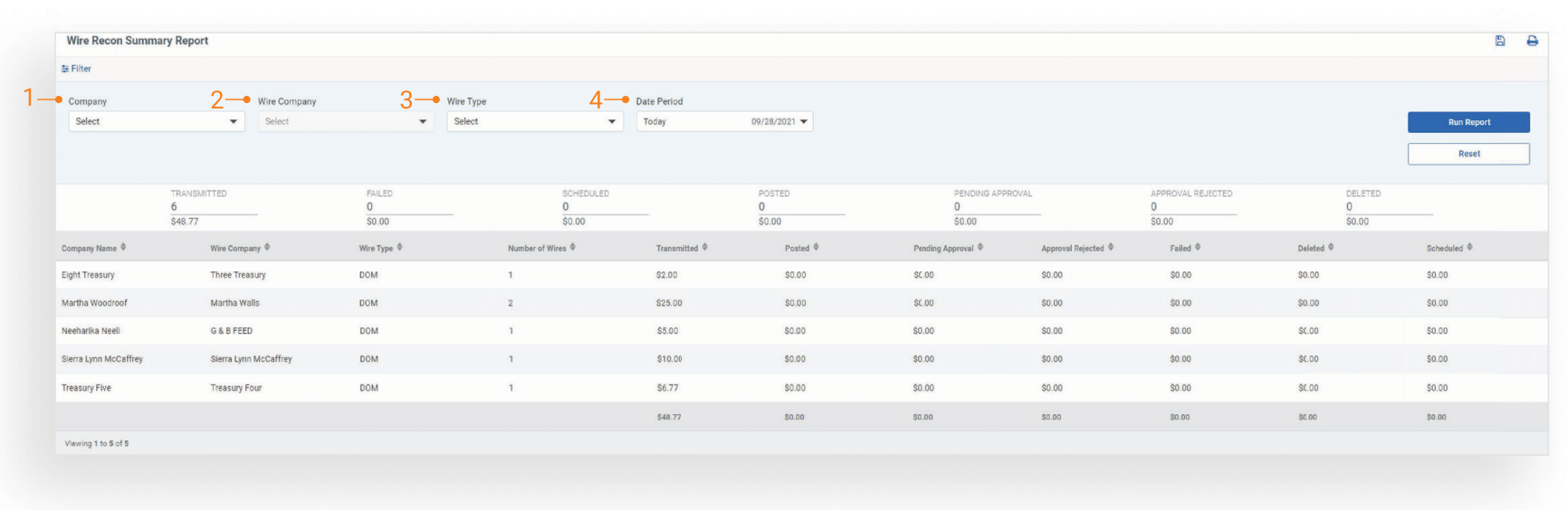 | Wire Recon Summary Report | Provides a summary of Wire payments by Wire Company including the total amount by status based on the selected criteria. If no filter criteria is selected the results will show all wire companies for the current date. |