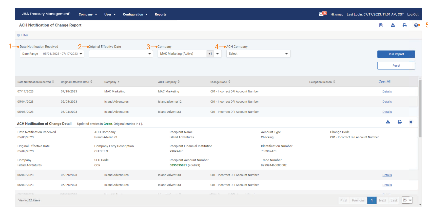 | ACH Notification of Change Report | Lists corrections notices received by Date Notification Received, Original Effective Date, Company, and ACH Company. If no filter criteria is selected the results will show correction notices for all companies for current date. |