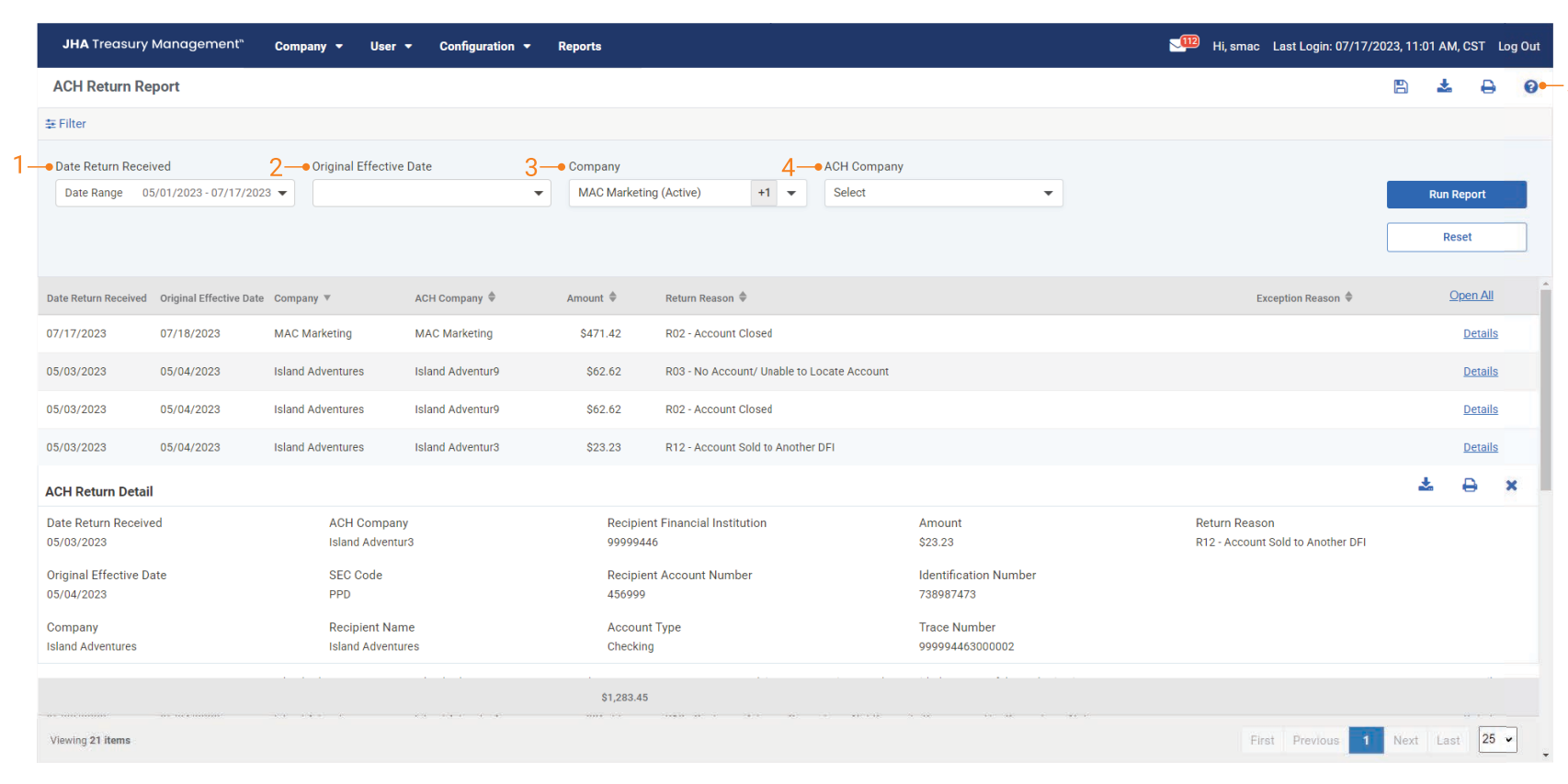| ACH Return Report | Lists return notices received by Date Return Received, Original Effective Date, Company, and ACH Company. If no filter criteria is selected the results will show return notices for all companies for current date. |