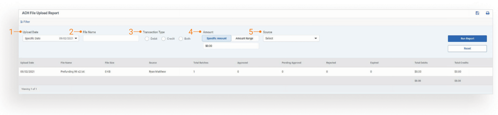 | ACH File Upload Report | Lists all ACH files uploaded by the Upload Date, File Name, File Size and Source. The report also lists the total number of payments and a summary of the payments in each status as well as Total Debits and Credits per file. |