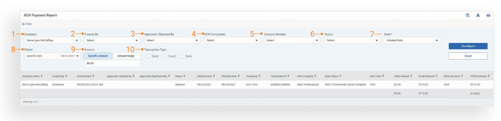 | ACH Payment Report | Lists all ACH Payments within the date period for the selected date type {Created, Initiated, or Effective) and companies. |