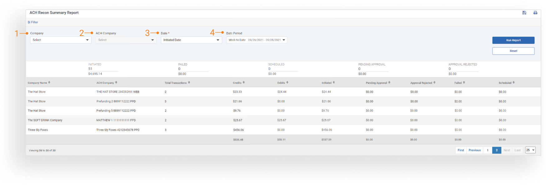 | ACH Recon Summary Report | Provides a summary of ACH payments by ACH Company for the selected date type {Created, Initiated, or Effective) and date period. The report also lists the total amount of debits and credits and payments by status. |