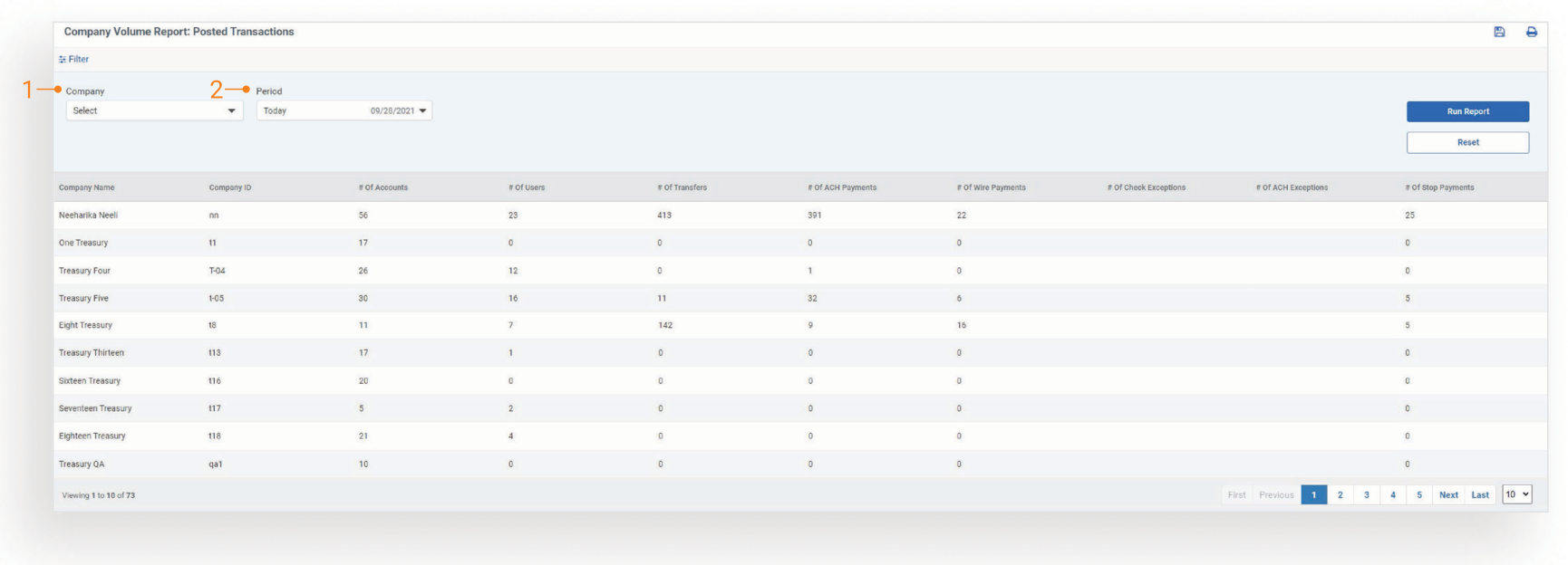 | Company Volume Report: Posted Transactions | Lists the number of ACH payments, Wire Payments, Transfers, Check Exceptions and ACH Exceptions by company. |