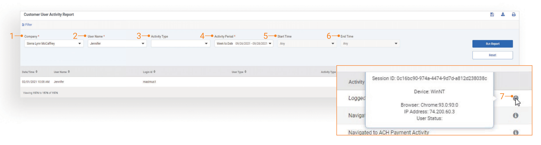 | Customer User Activity Report | Lists the User Name, Login ID, User Type and activity information for the selected users of the company. The current day will be used as the default for the activity period. Session ID, device, browser, and IP Address is additional information on the report. |