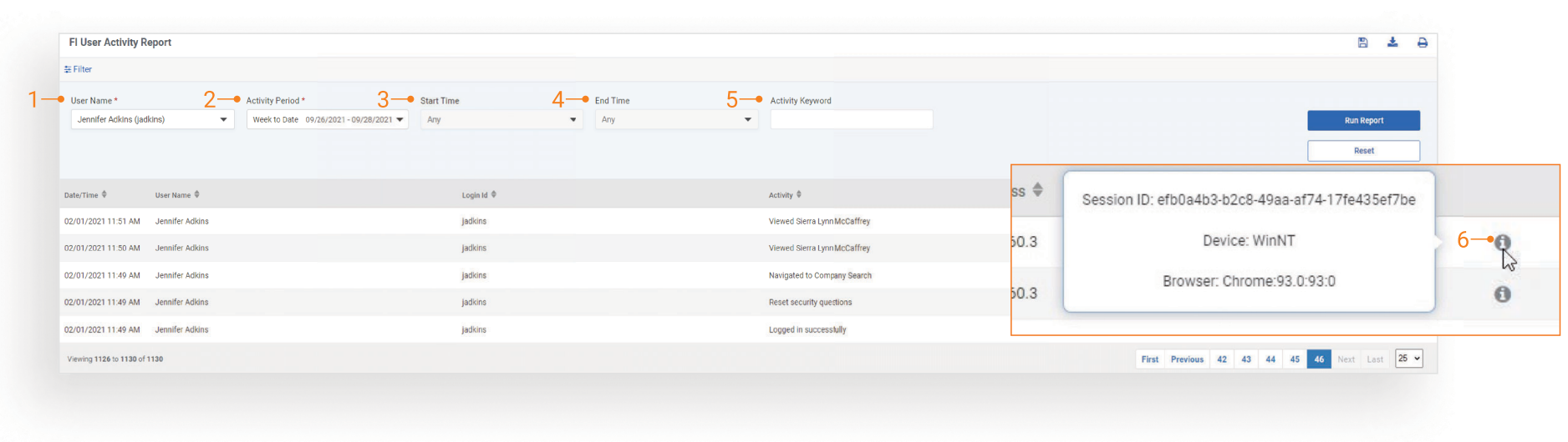 | Fl User Activity Report | Lists the User Name, Login ID, Login ID, Activity and IP address for the selected user during. Session ID, device, and browser is additional information on report. |