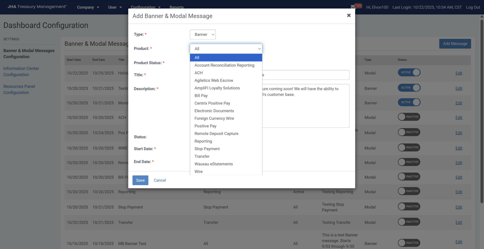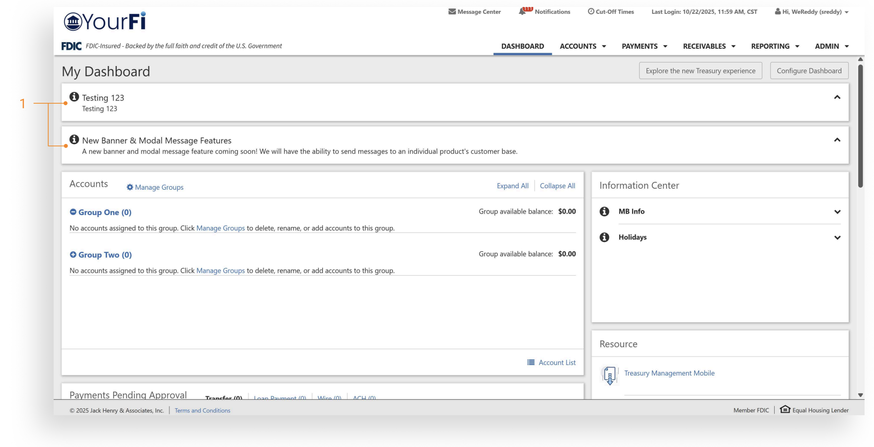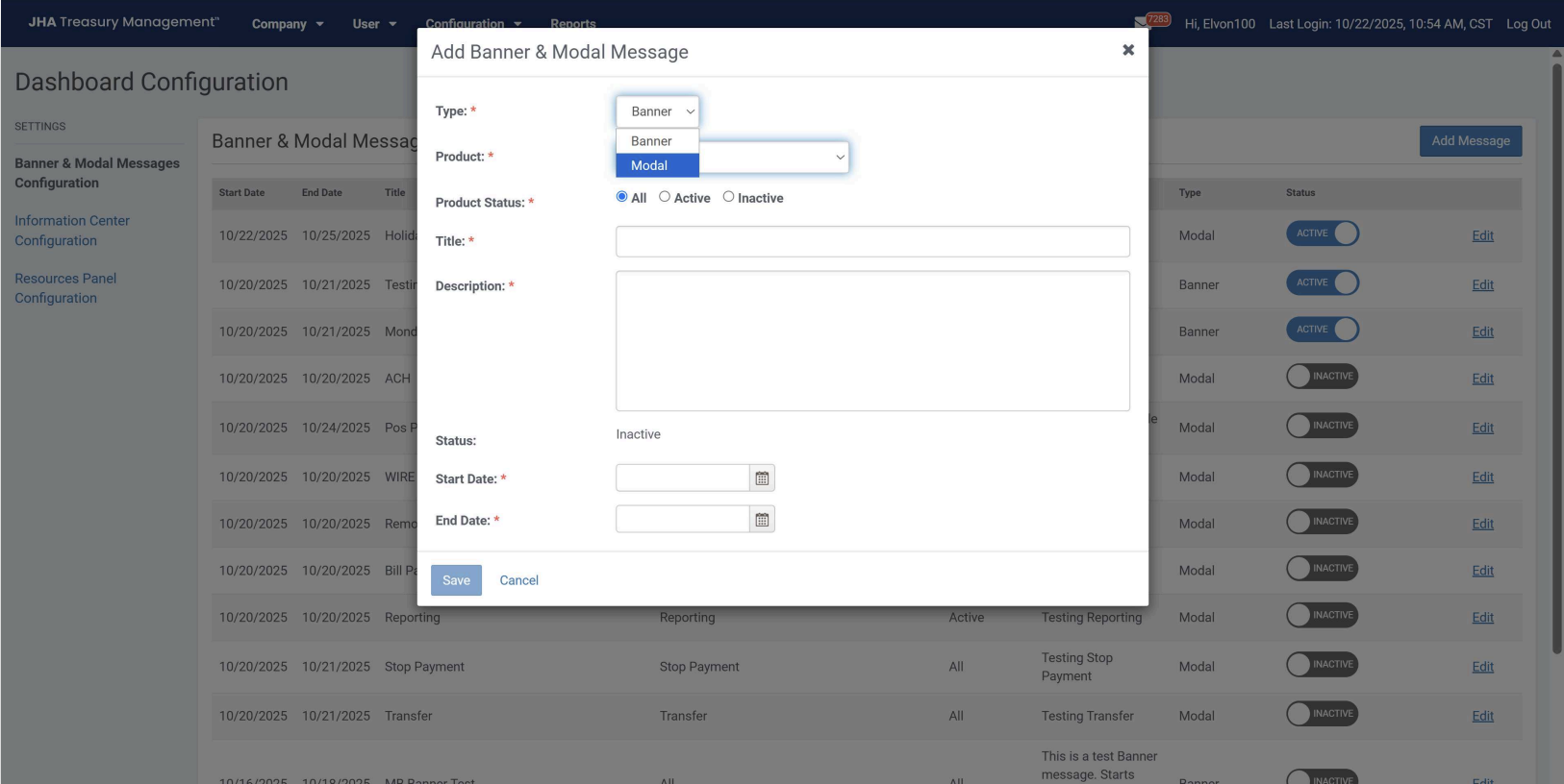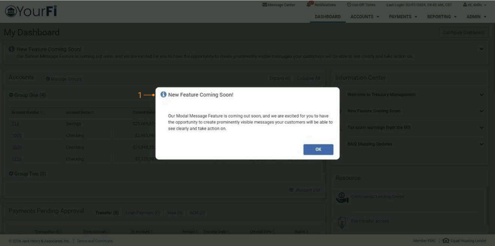 The modal message is available when a channel user logs into Treasury Management. This message type will require the user to acknowledge the message and will only display one time upon login. Messages selected to display as a modal will also display in the Information Center widget.