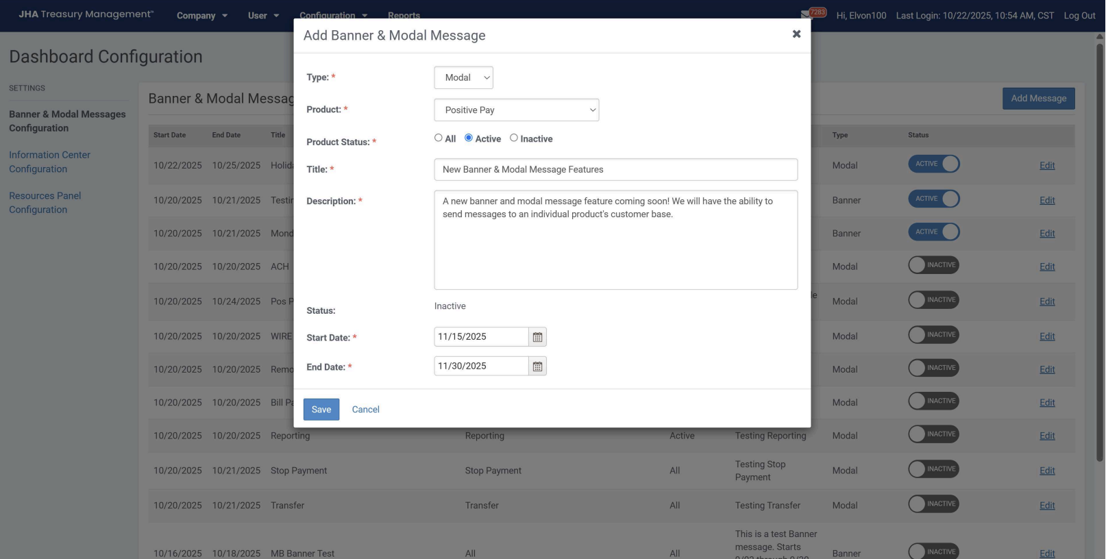 Set the banner or modal message status to active to display a message in Channel. To edit a message, set the status to inactive to enable the edit function.