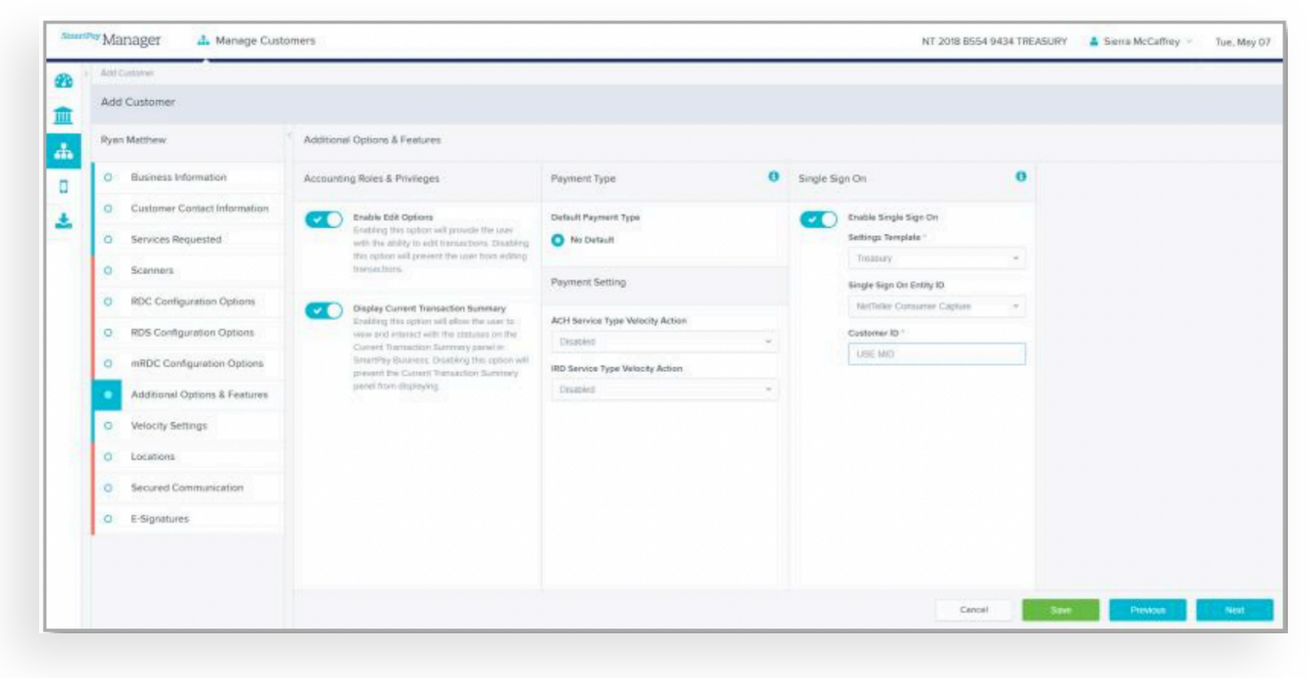 Navigate to SmartPay Manager > Manage Customers > Add Customer > Additional Options & Features.