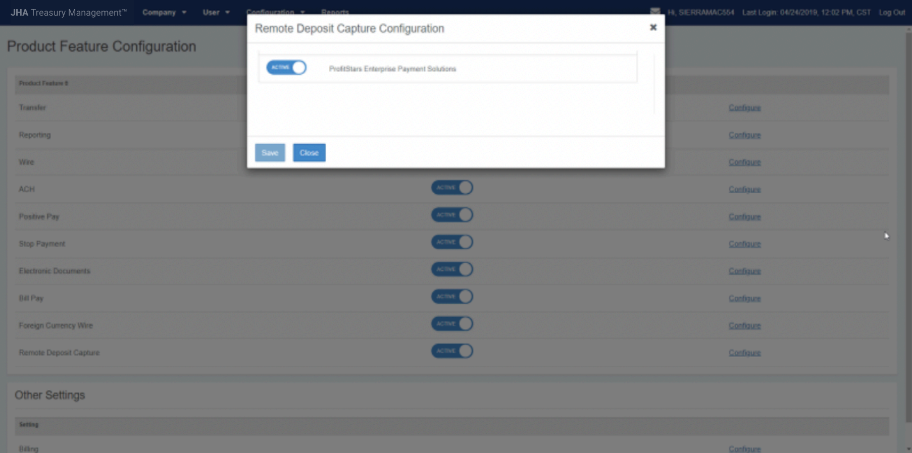 Navigate to Company Details > Product Feature Configuration > Remote Deposit Capture.
