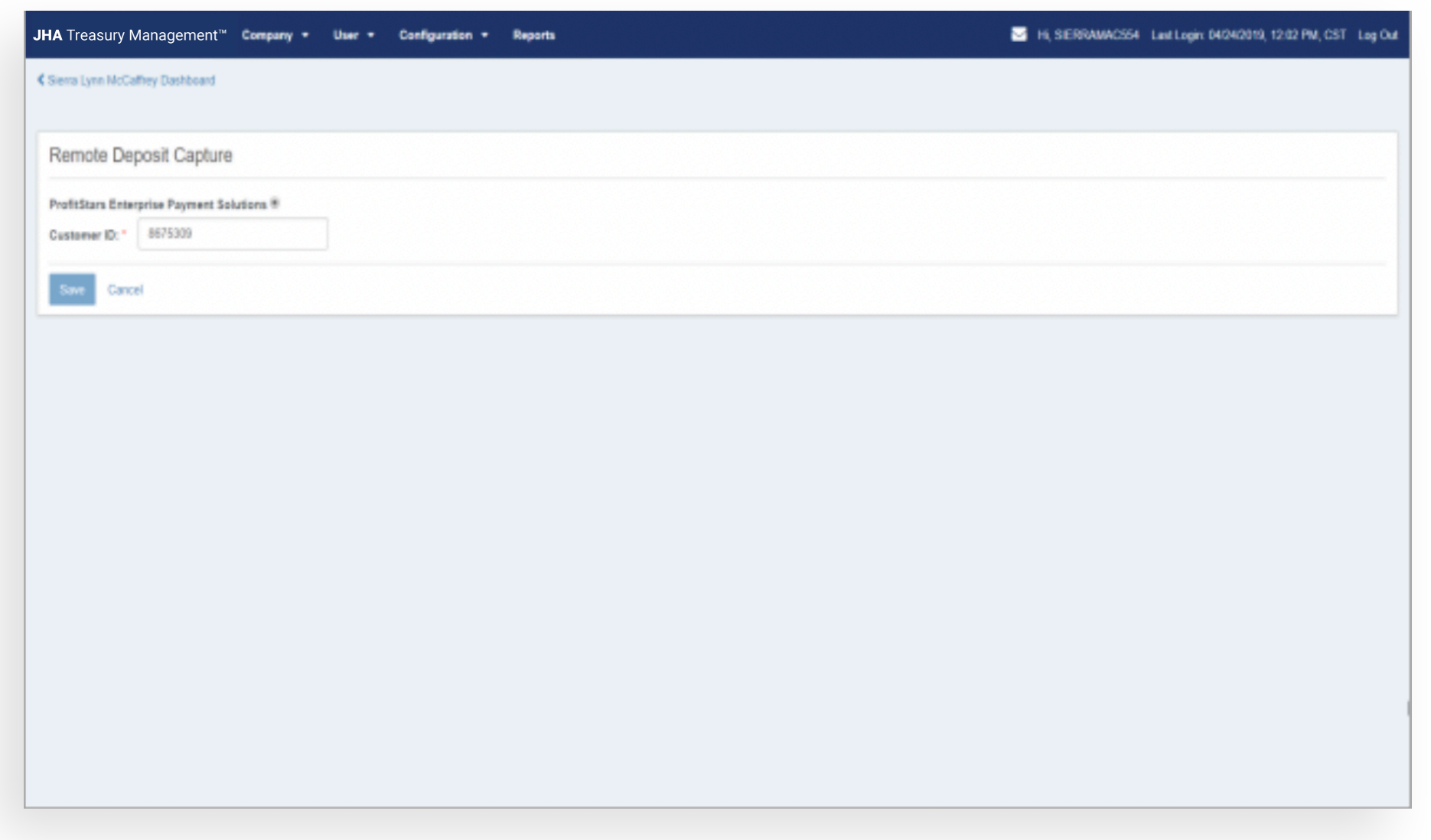 To Enable Remote Deposit Capture (Company Level), input the ProfitStars Merchant ID in the Customer ID field.