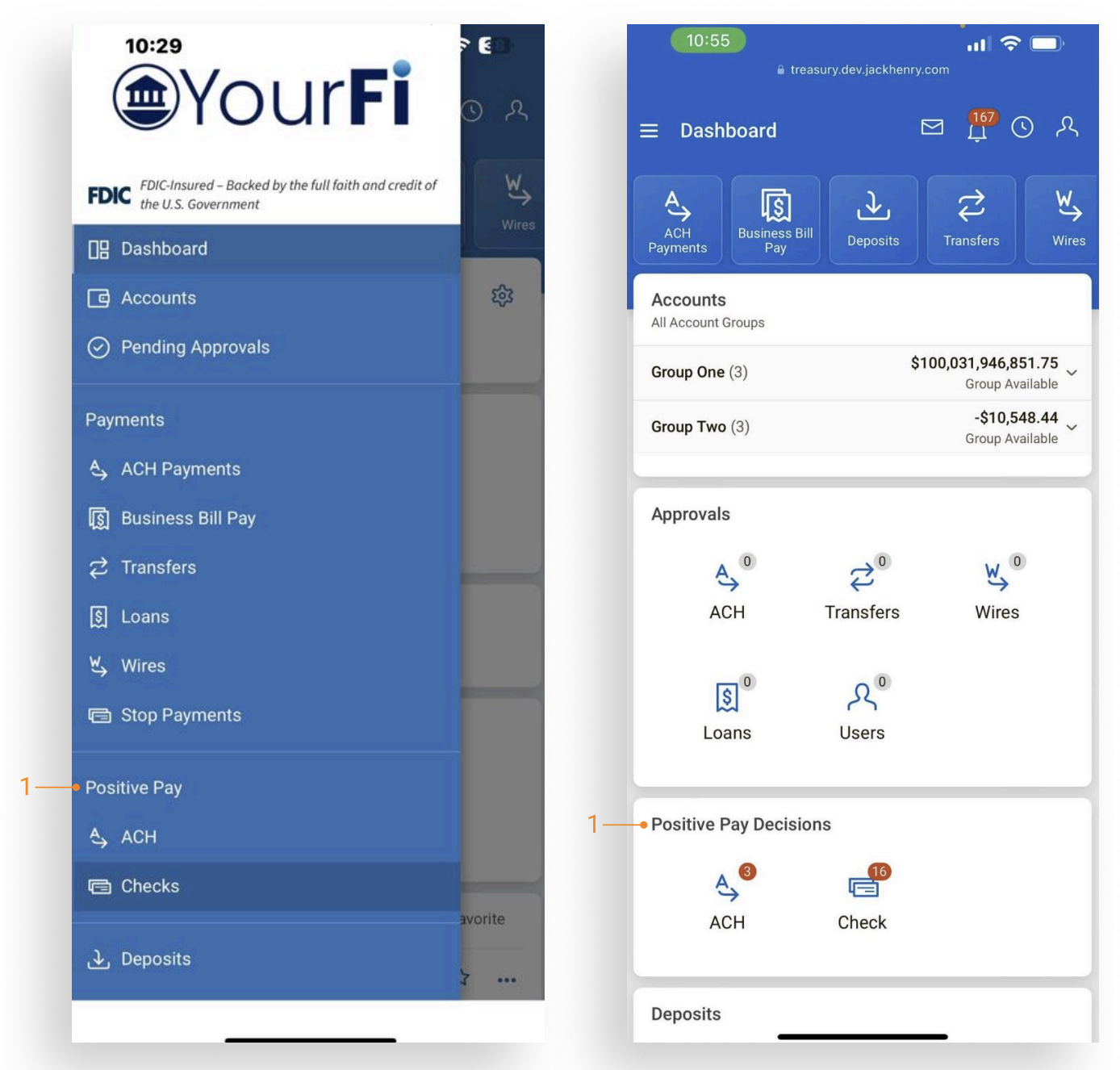 Users can select Positive Pay Exceptions from the Dashboard tile or the fly-out navigation menu.