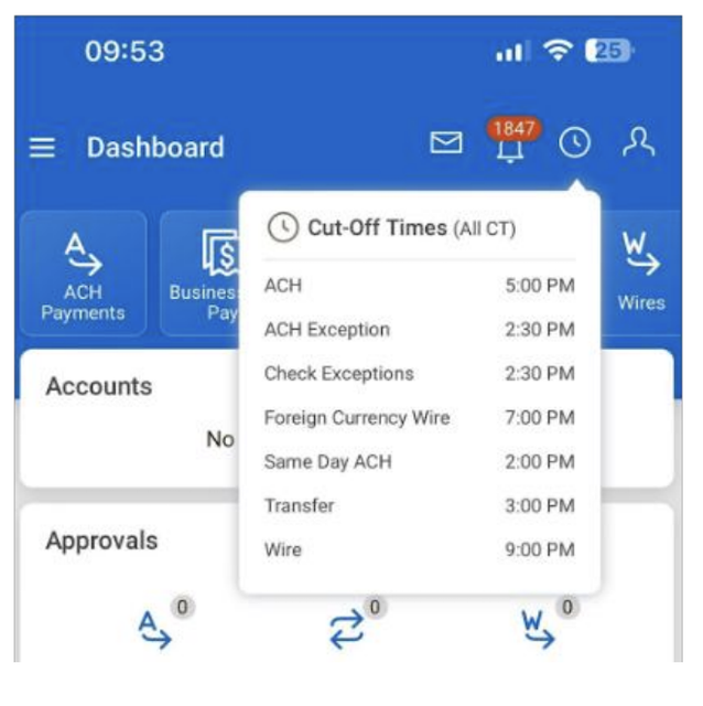 Note: To view ACH and check exceptions cut-off times, tap the Cut-Off Times icon at the top of the dashboard.
